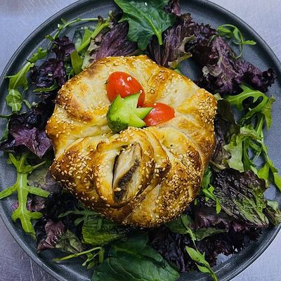 Телятина, помидоры черри, оливковые масло, соль, листья салата