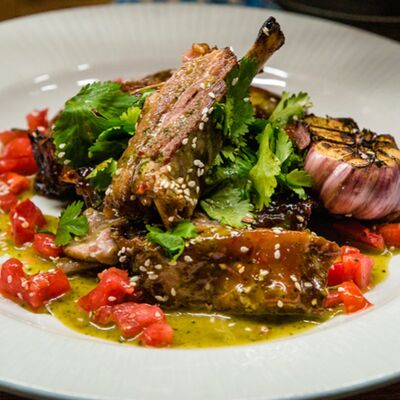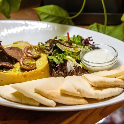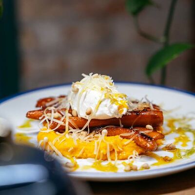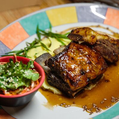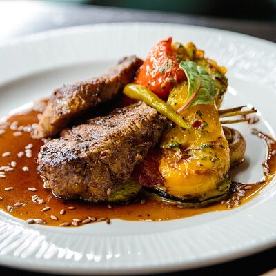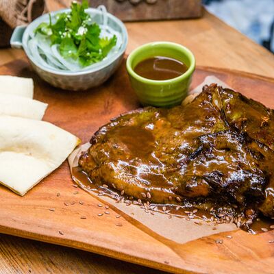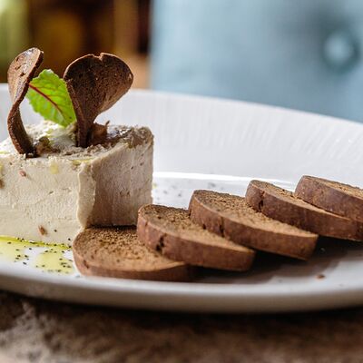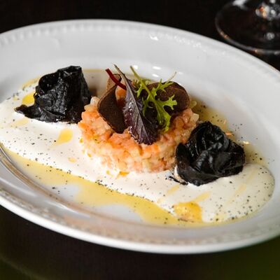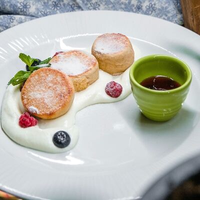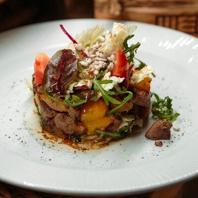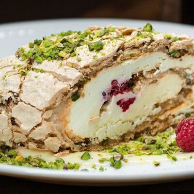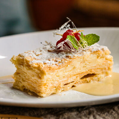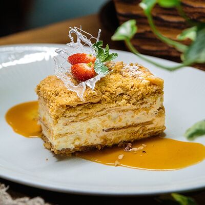 Медовые коржи, крем на основе сметаны. Подается с сотами, карамельным соусом и ягодами (малина либо ежемалина, либо голубика)