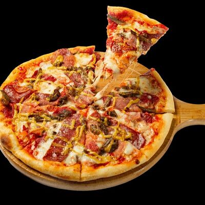 Бекон говяжий, моцарелла, томатный соус на основе пелати, жареный лук, соус гамбургер-карри (26 см)