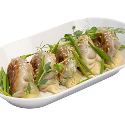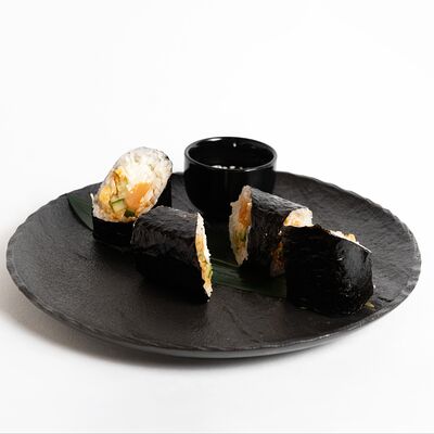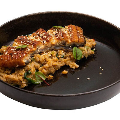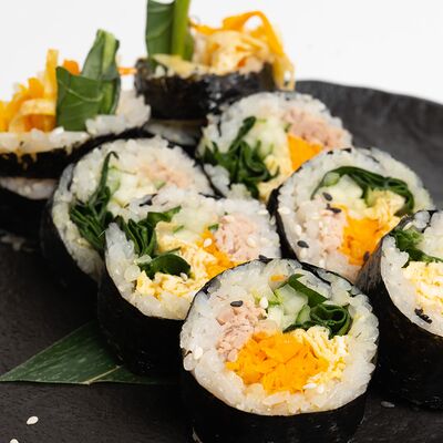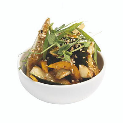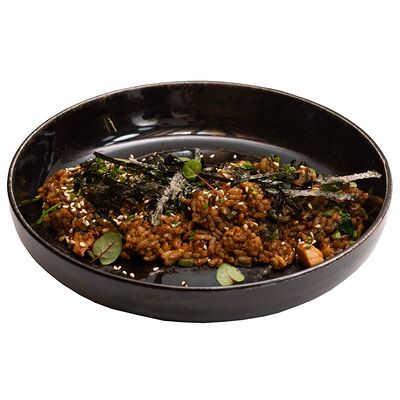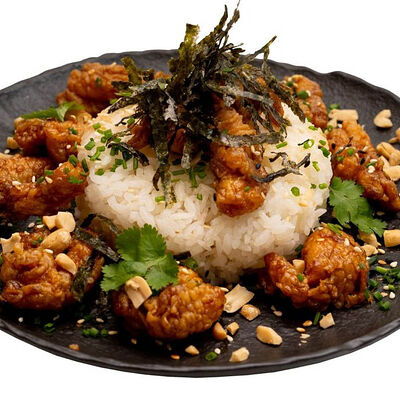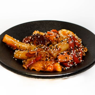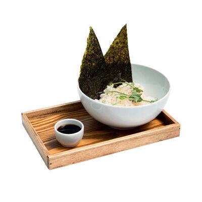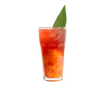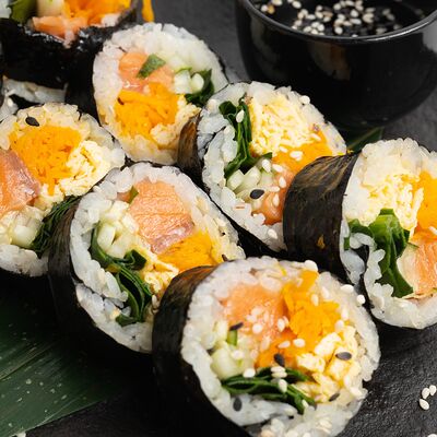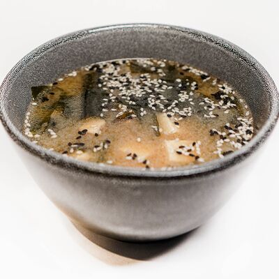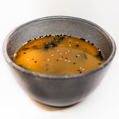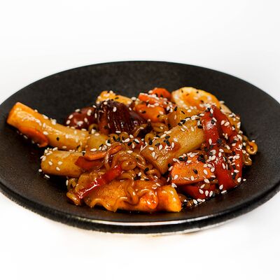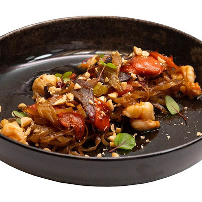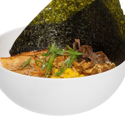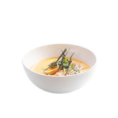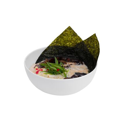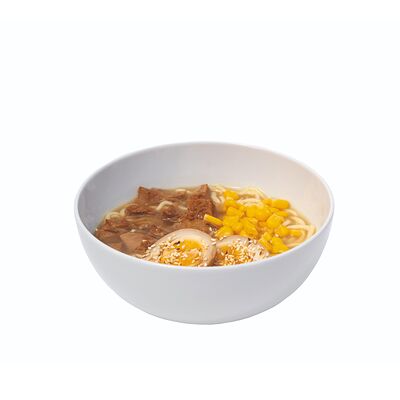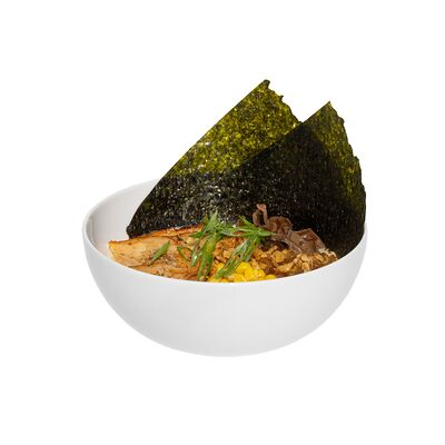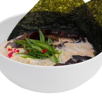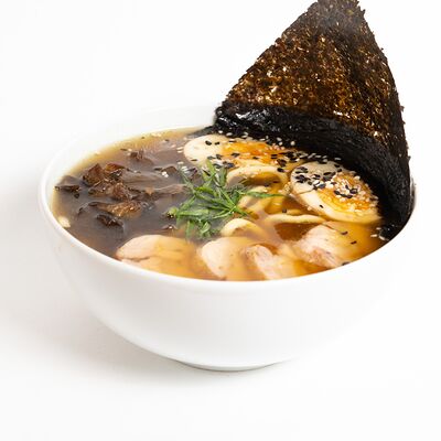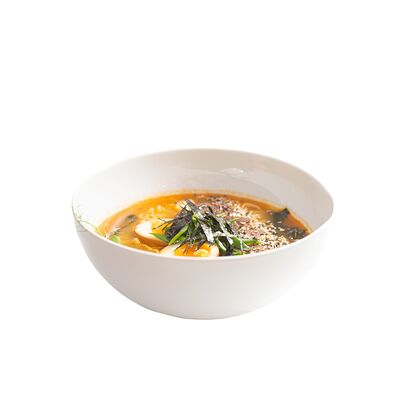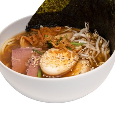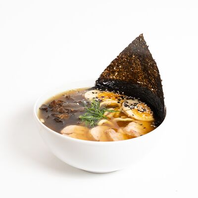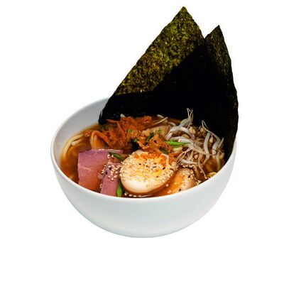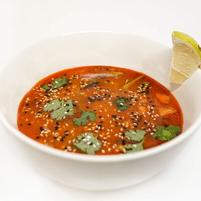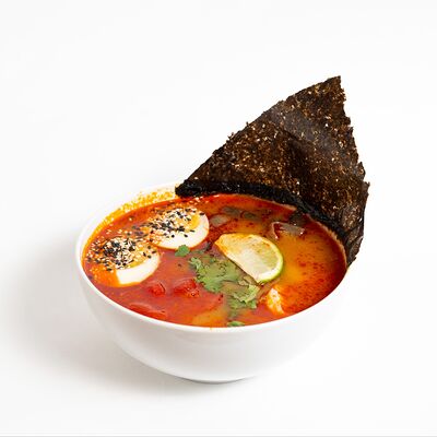 Классический бульон том ям с креветками, яично-пшеничной лапшой, грибами муэр, томатами черри и маринованным яйцом аджитама. Подается с долькой лайма и кинзой
