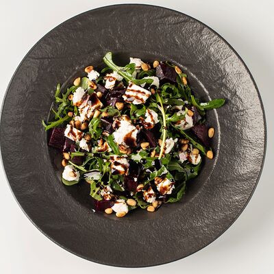 Руккола, свекла, козий сыр, орех кедровый, заправка