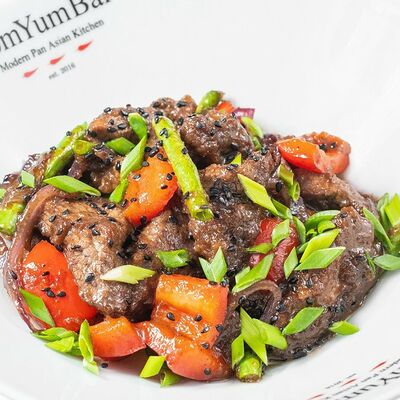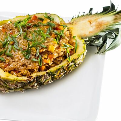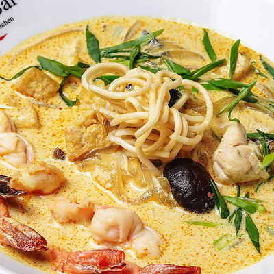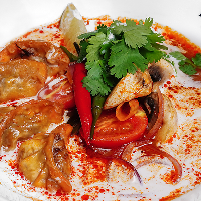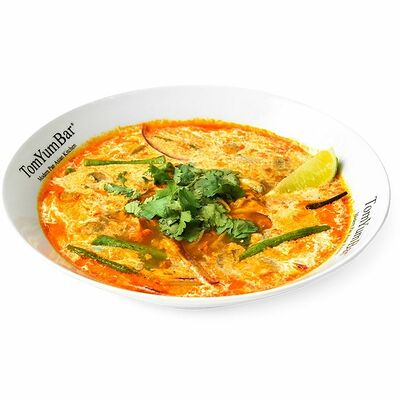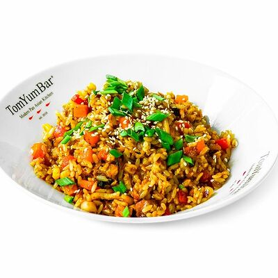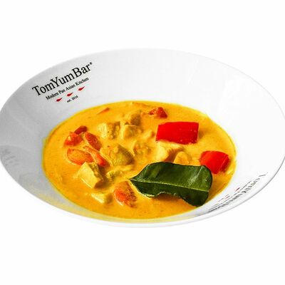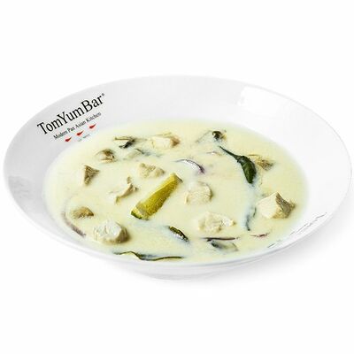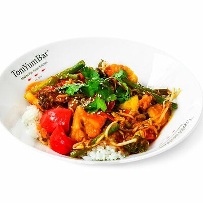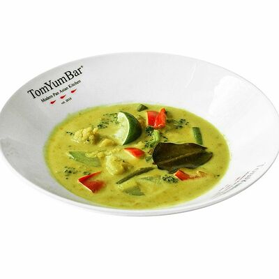 Традиционное азиатское острое блюдо, приготовленное на пасте из разнообразных специй и сливках с кокосовым молоком. В составе: стручковая фасоль, цветная капуста, брокколи, паприка, цукини, лайм, кинза. Подается с порцией пропаренного риса