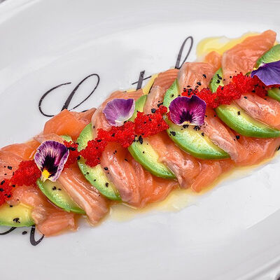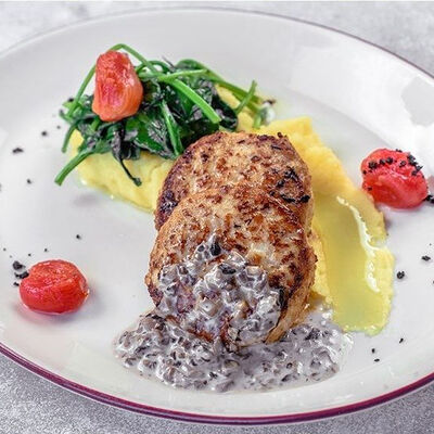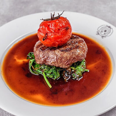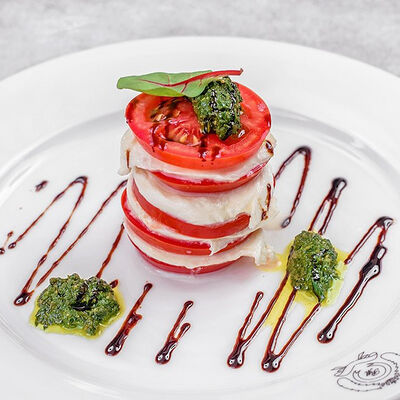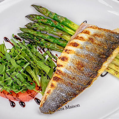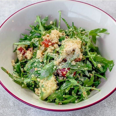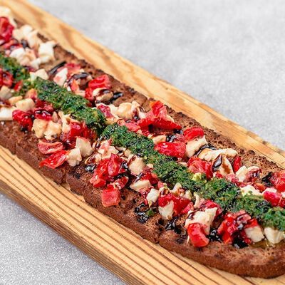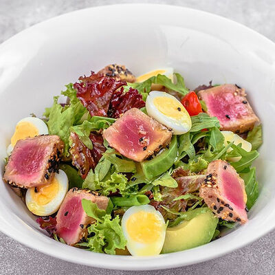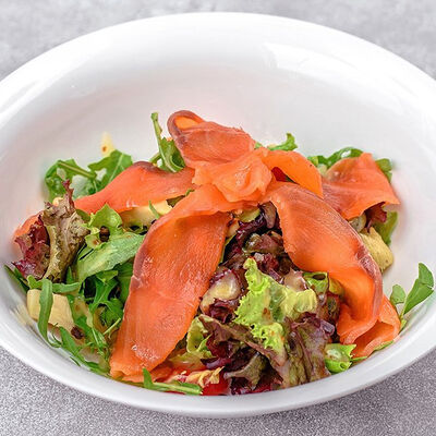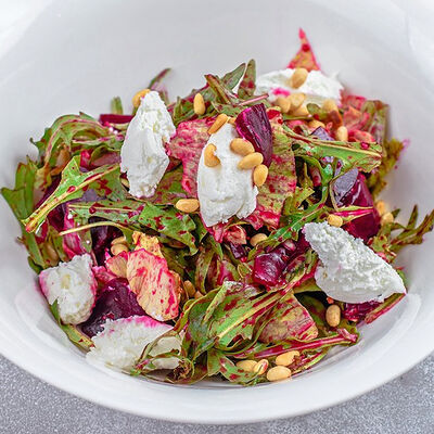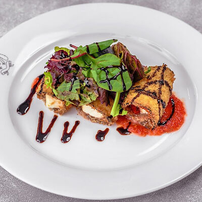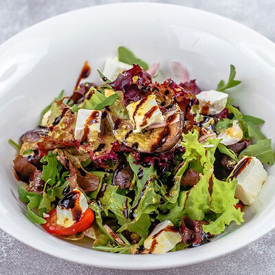 Микс салат с жареными на гриле баклажанами, луком шалот, сыром Фета, заправка из оливкого масла, орегано и винного уксуса