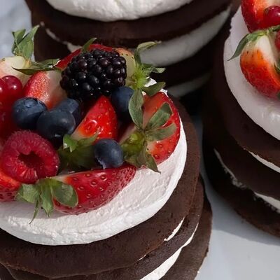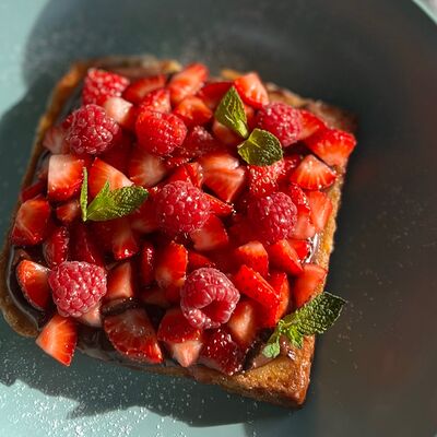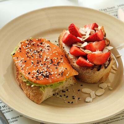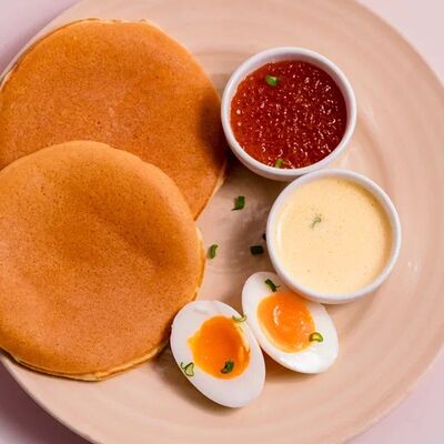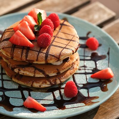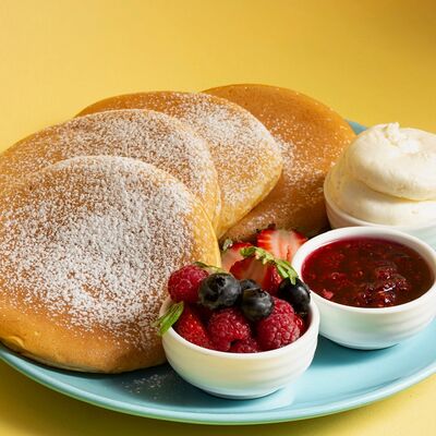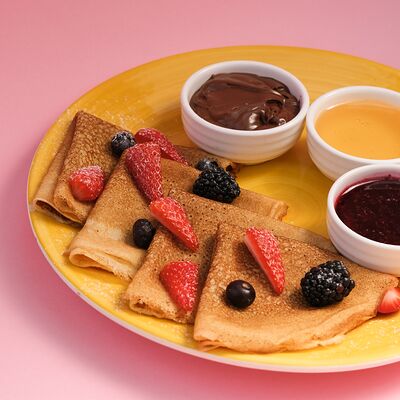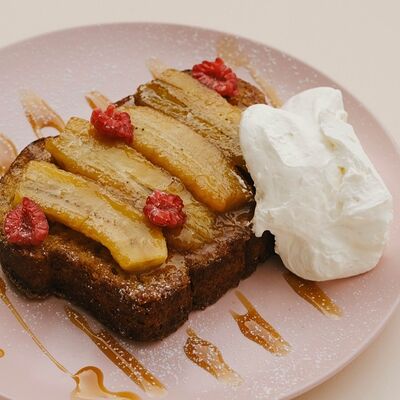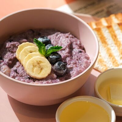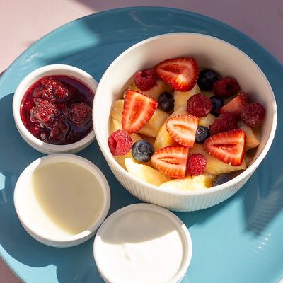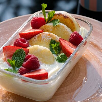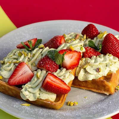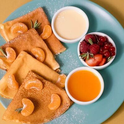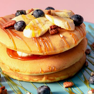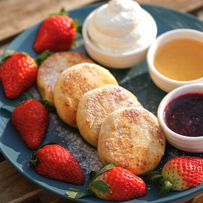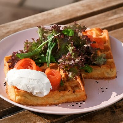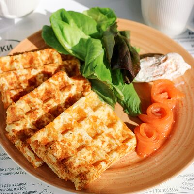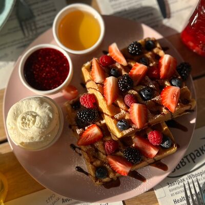 Нежные творожные вафли с бананом и голубикой, подаются со сметаной и мёдом
