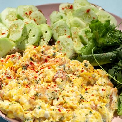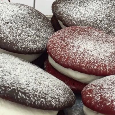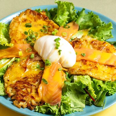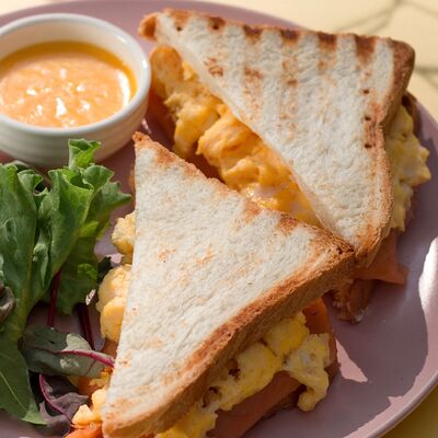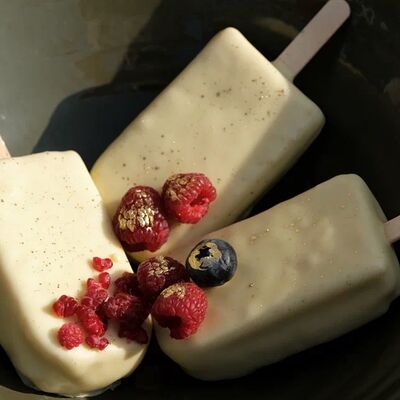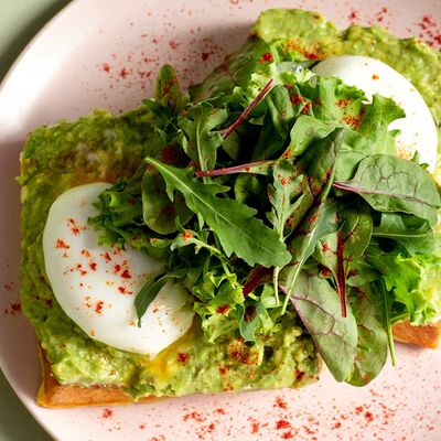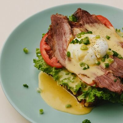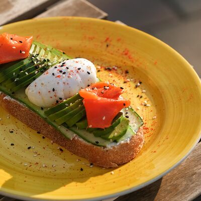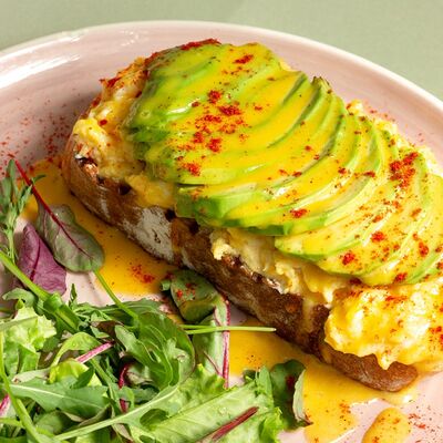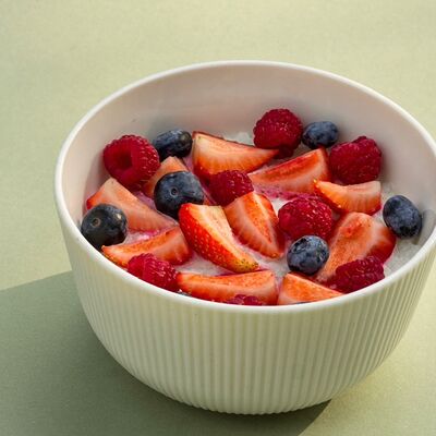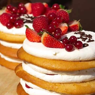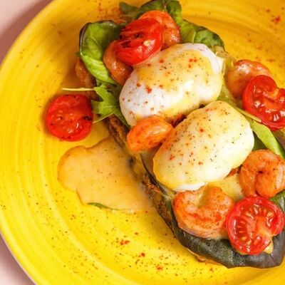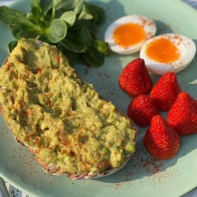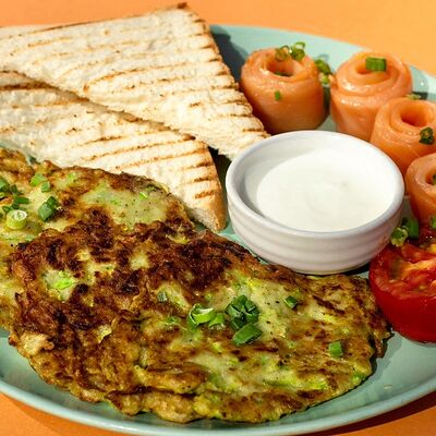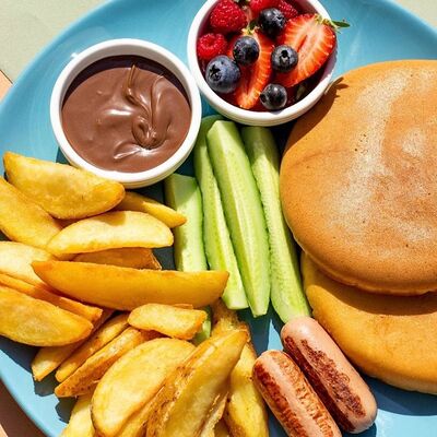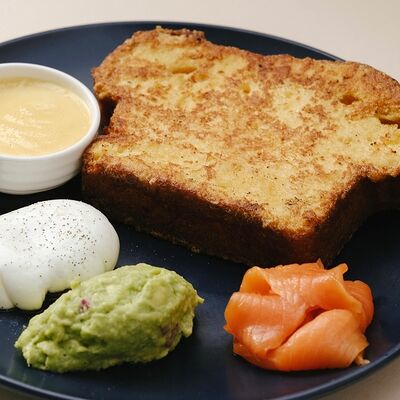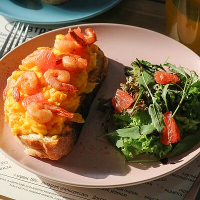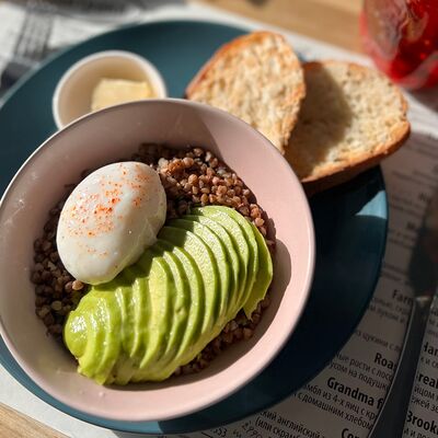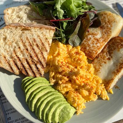 Нежные творожные вафли с бананом и голубикой, подаются со сметаной и мёдом