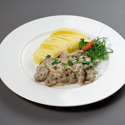 Бефстроганов из говядины в сливках с картофельным пюре доставка
