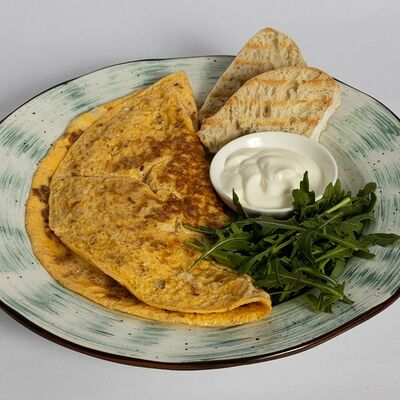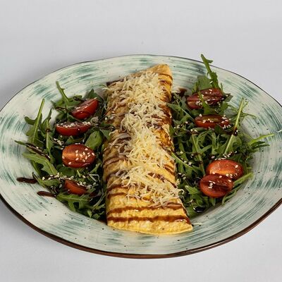 Блины, манго, крем-чиз, топпинг карамельный, миндальные лепестки Блины - яйца, соль, сахар, молоко, мука