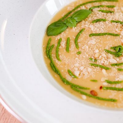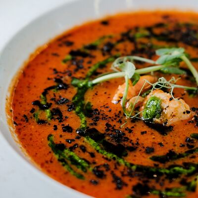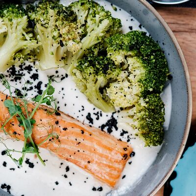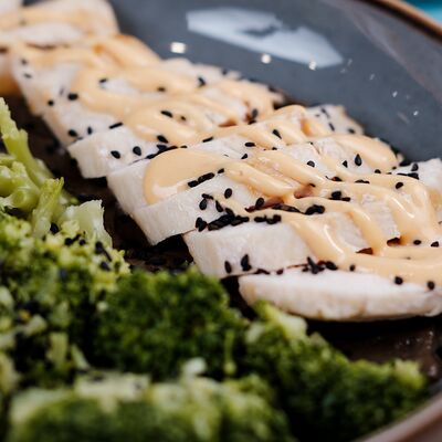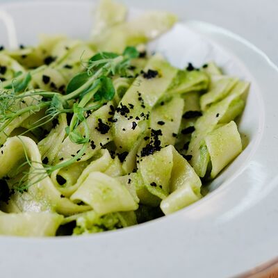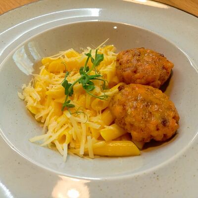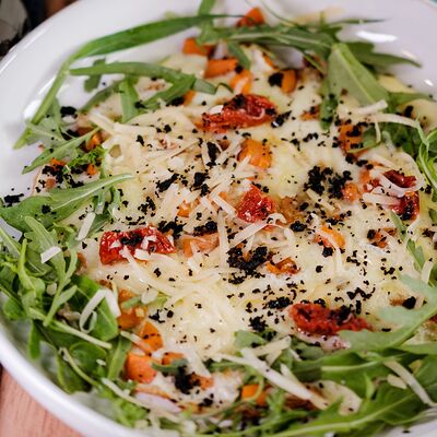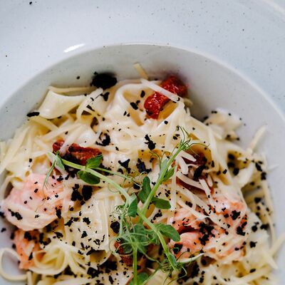 Паста феттуччине, молоко кокосовое, лосось, пармезан, маслины сушеные, томаты вяленые