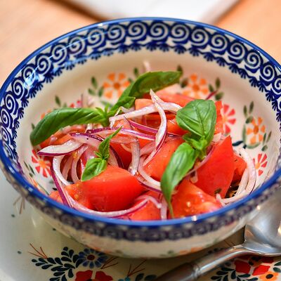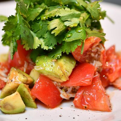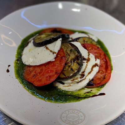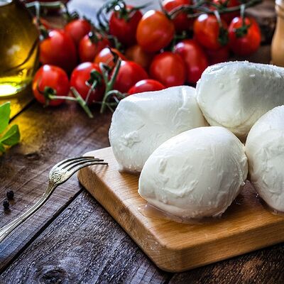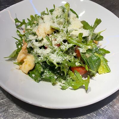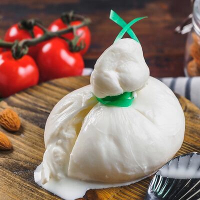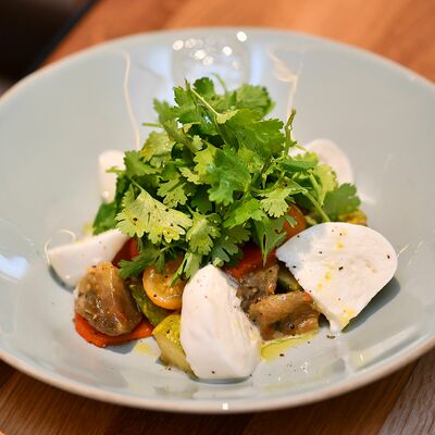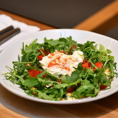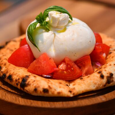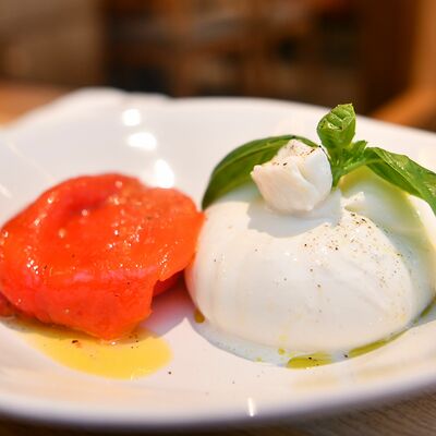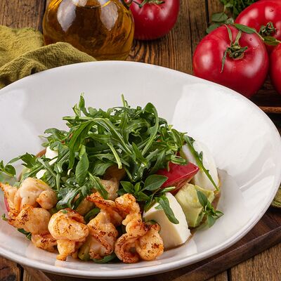 Томаты, креветки, сыр страчателла, базилик