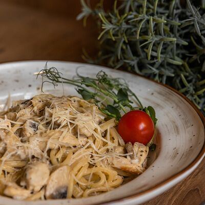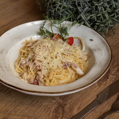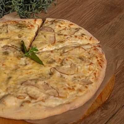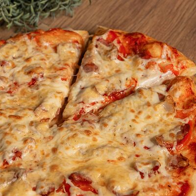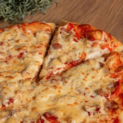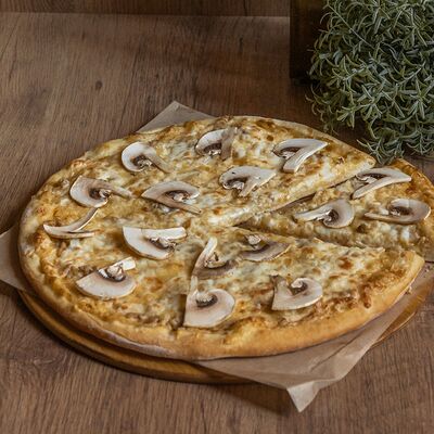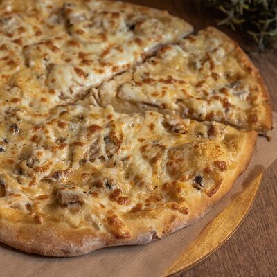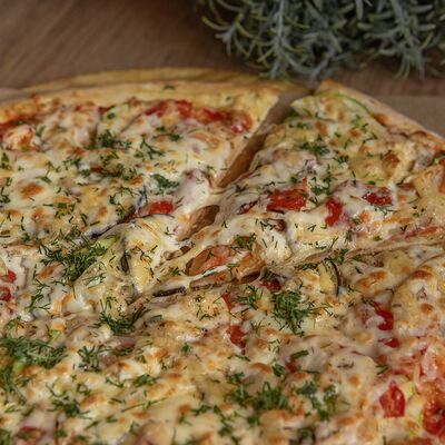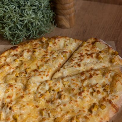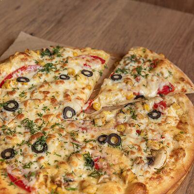 Сливочный соус, курица, шампиньоны, кукуруза, помидоры, моцарелла, зелень, маслины (30 см)