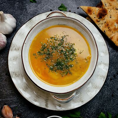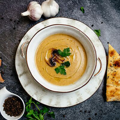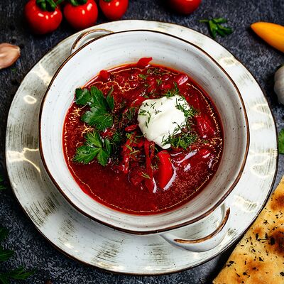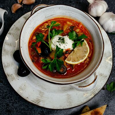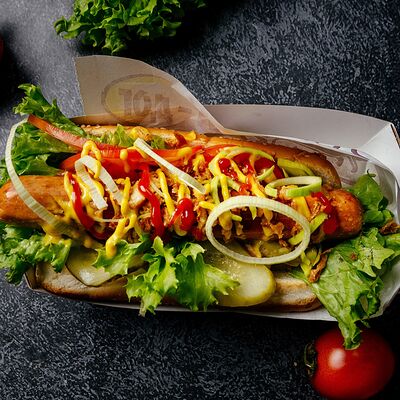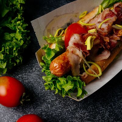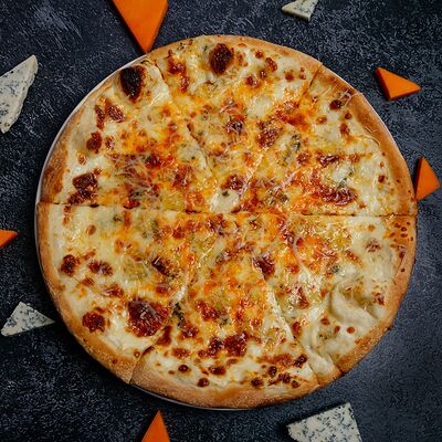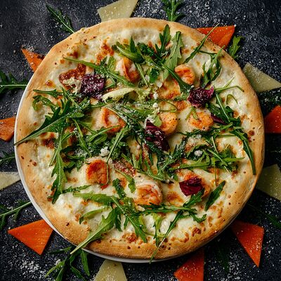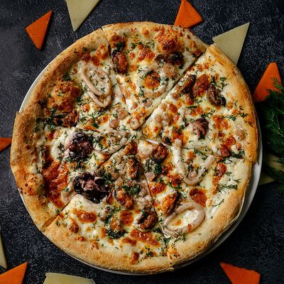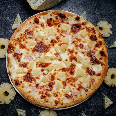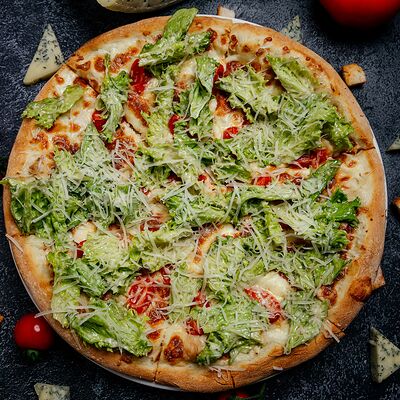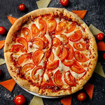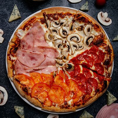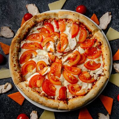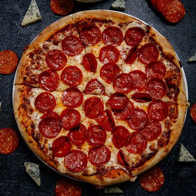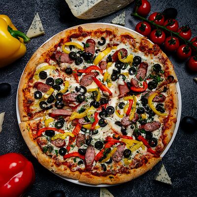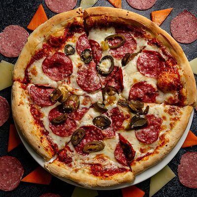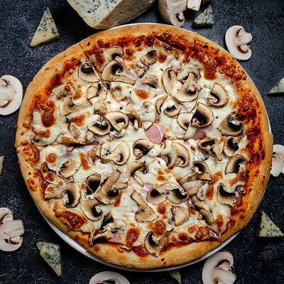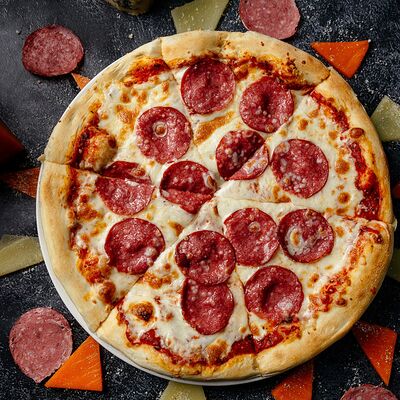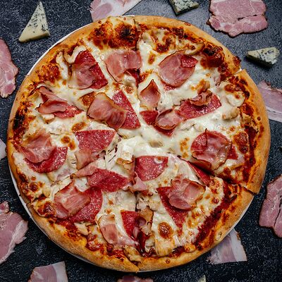 Тесто, фирменный соус, ветчина, грибы, салями, помидор (33 см)