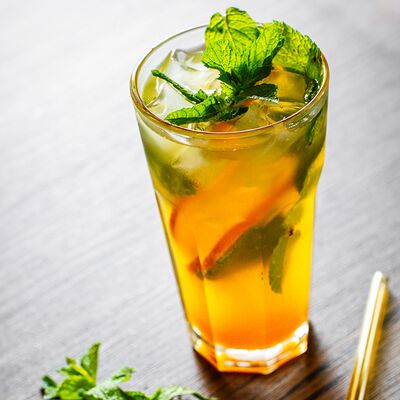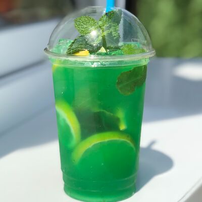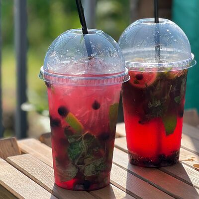 Лимонад Bluberry - собственного приготовления, состоит из : черники, мяты, газированной воды, лайма, льда