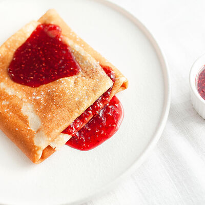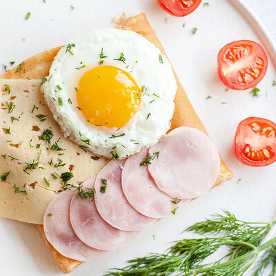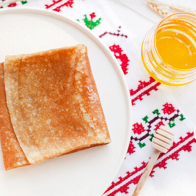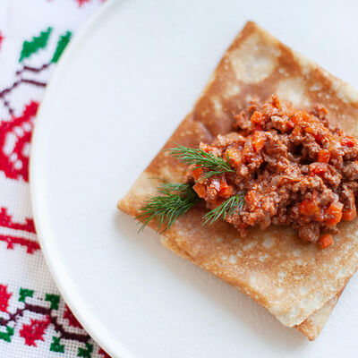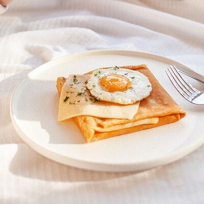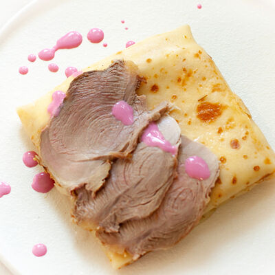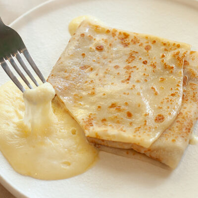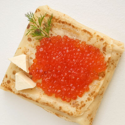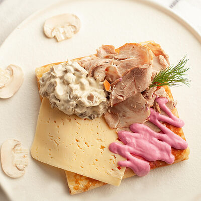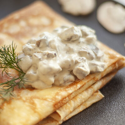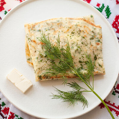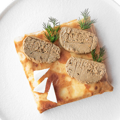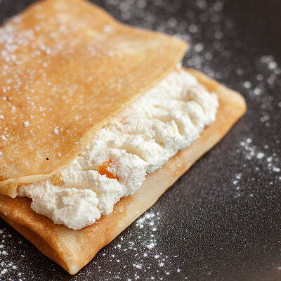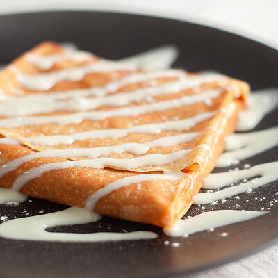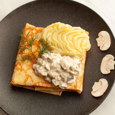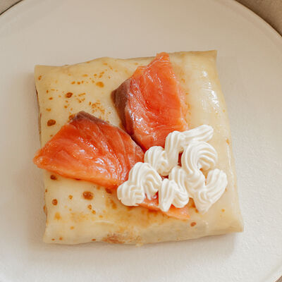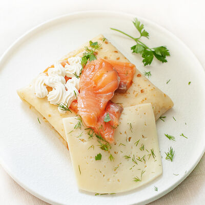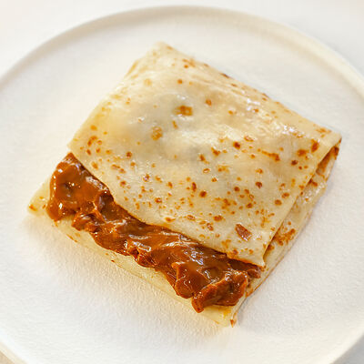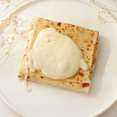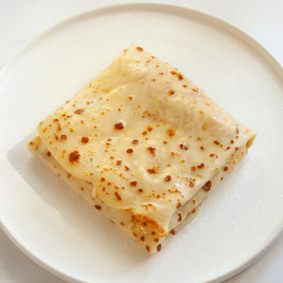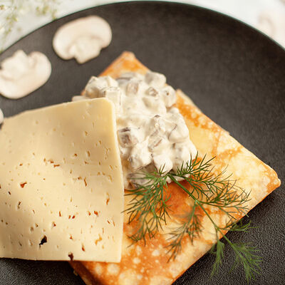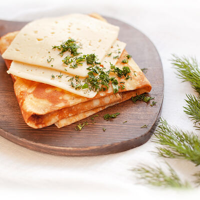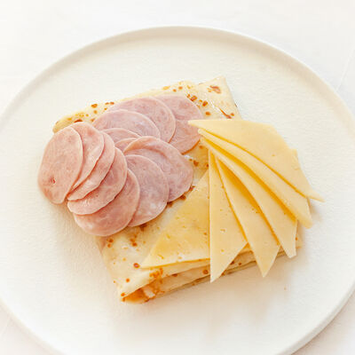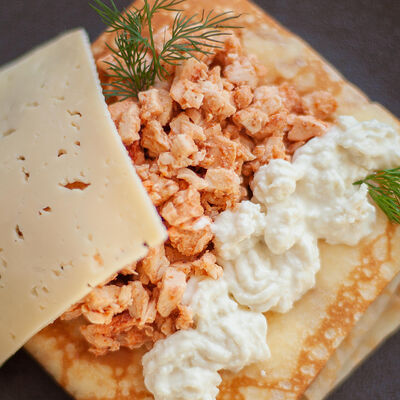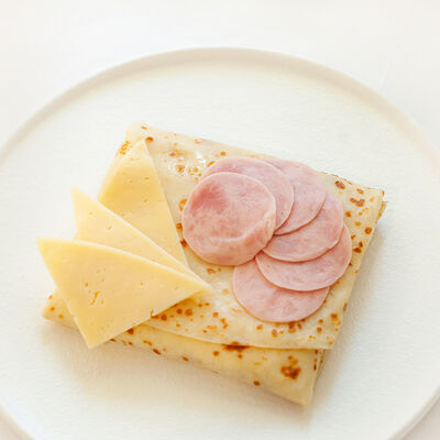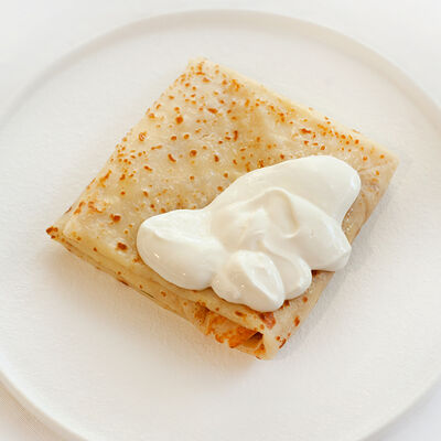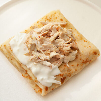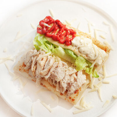 Большой премиум-блин с несколькими начинками: запеченная куриная грудка, соус Цезарь собственного приготовления, сливочный сыр Тильзитер, салат Айсберг, кетчуп
