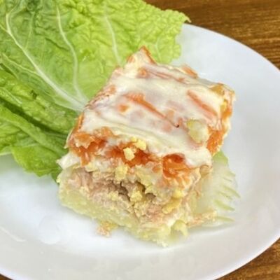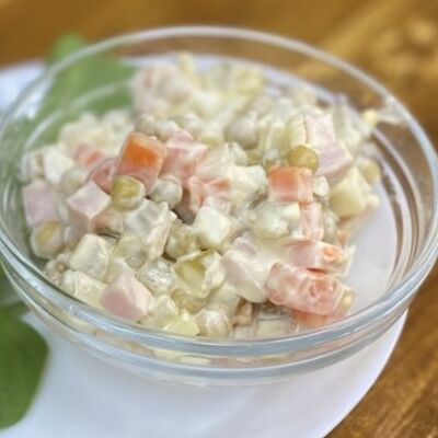 Ветчина, соленый огурец, горошек, яйцо, морковь, картошка, майонез, соль