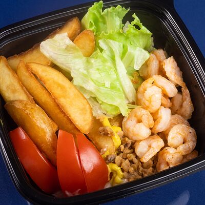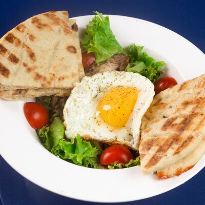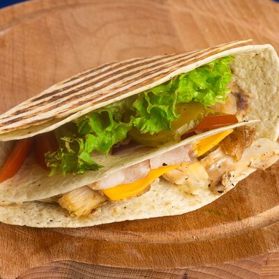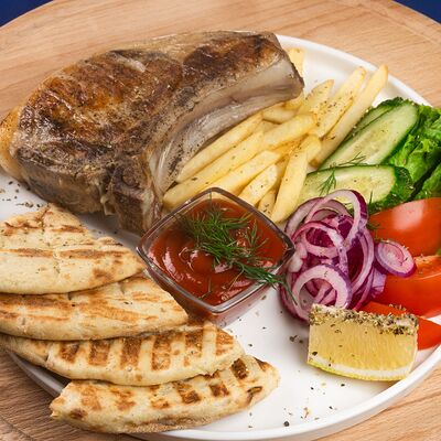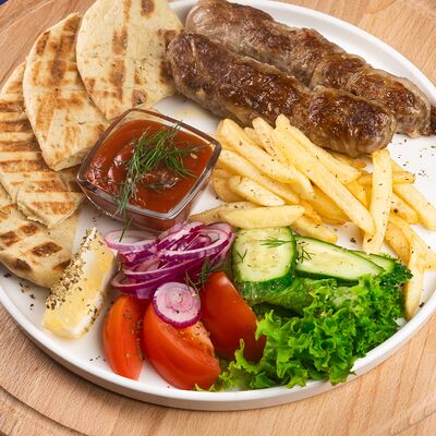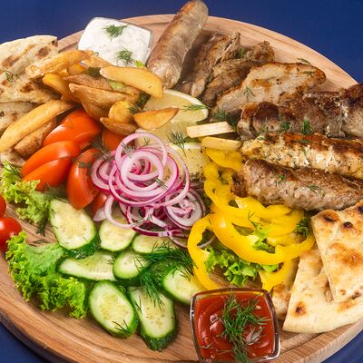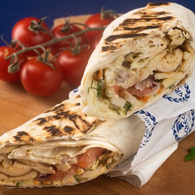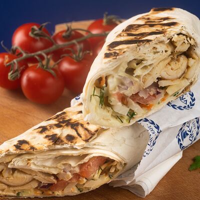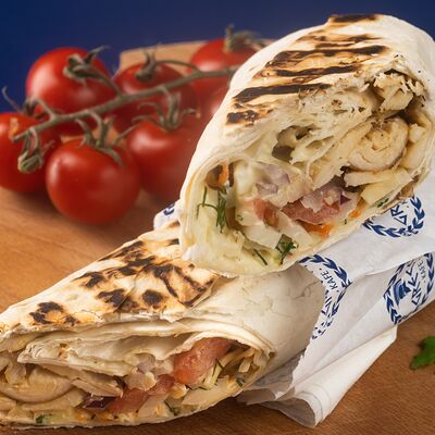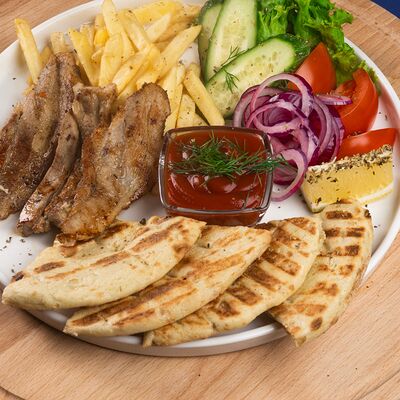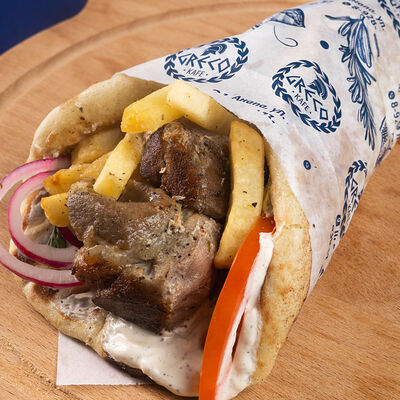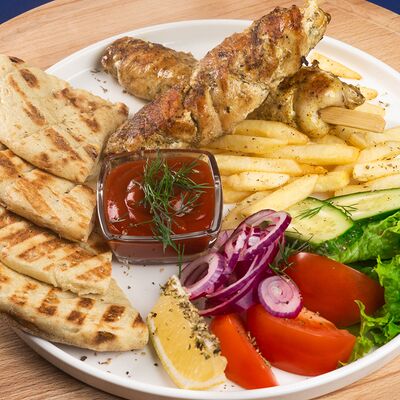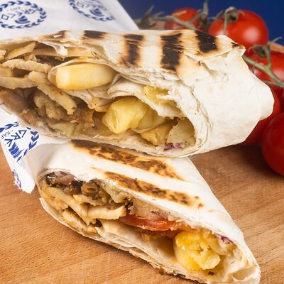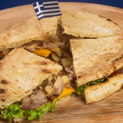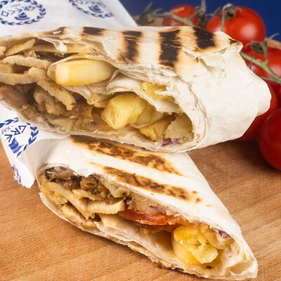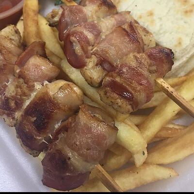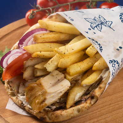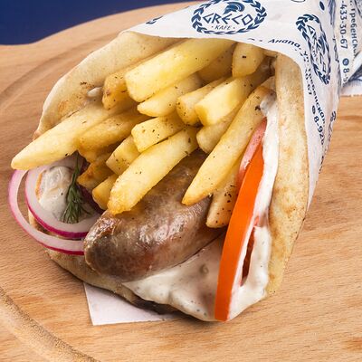 Греческая пита, соус Дзадзики, лук, помидор, куриное филе в беконе, картофель фри