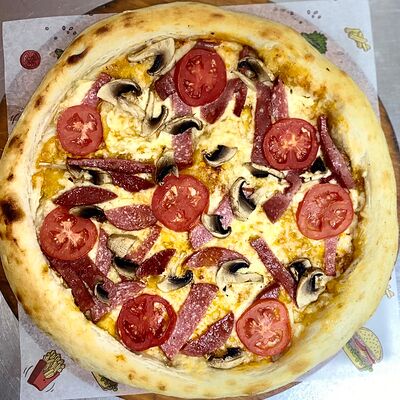 Биг Тейсти - бургер из 100% натуральной свежей говядины на булочке с кунжутом, плавленый сыр, свежий салат, помидор, лук, соус биг тейсти