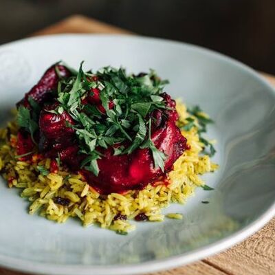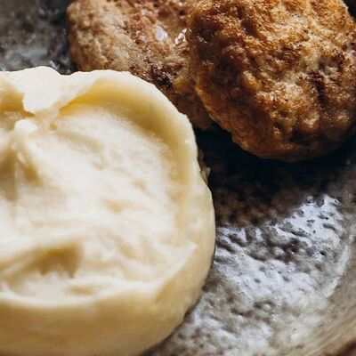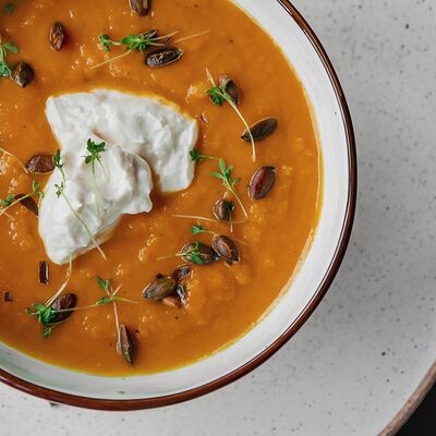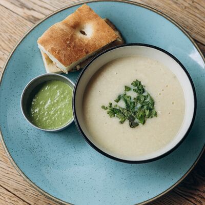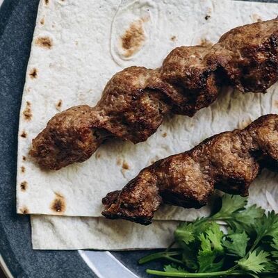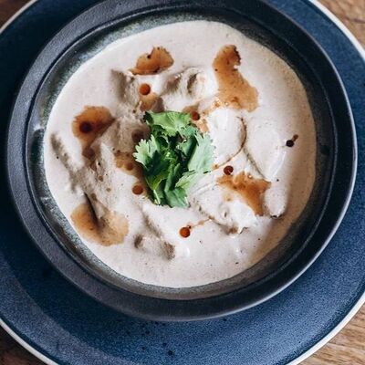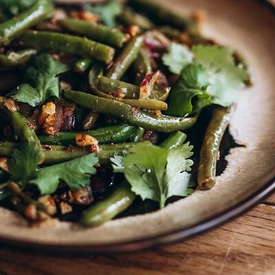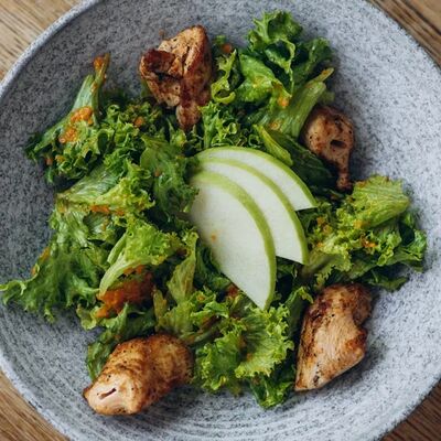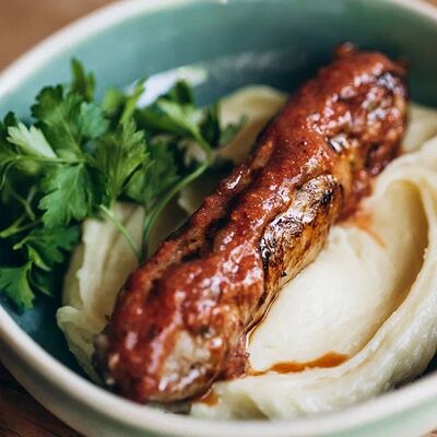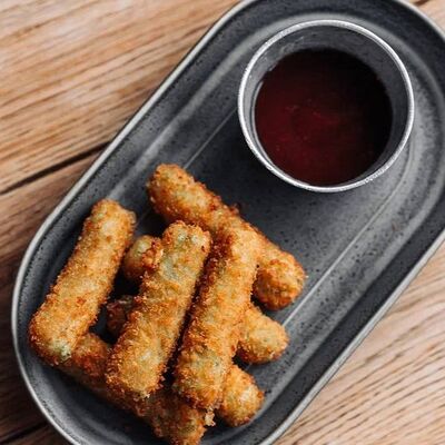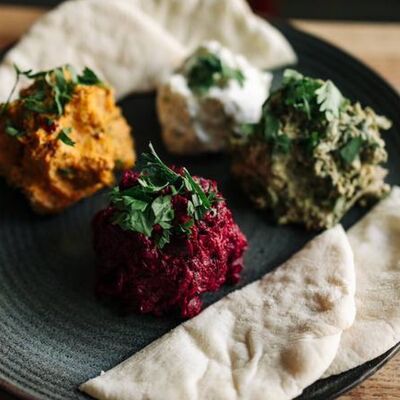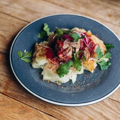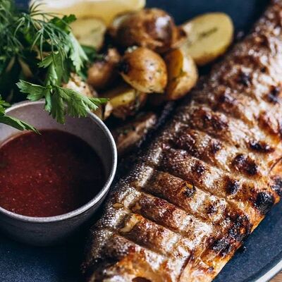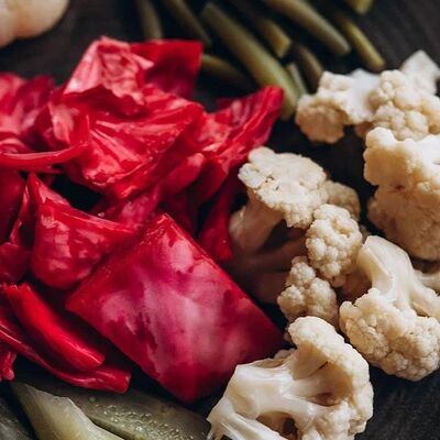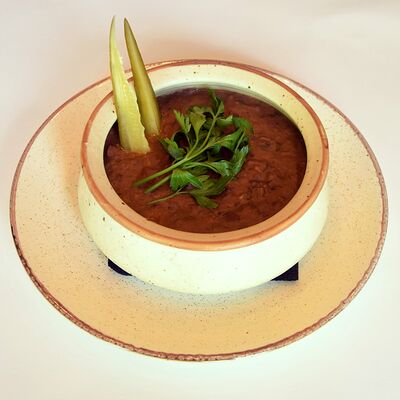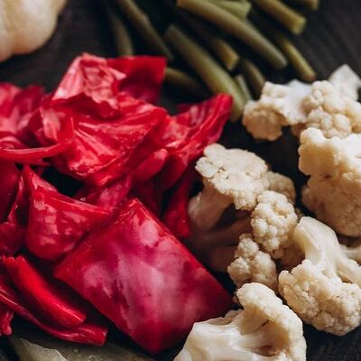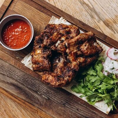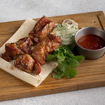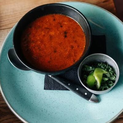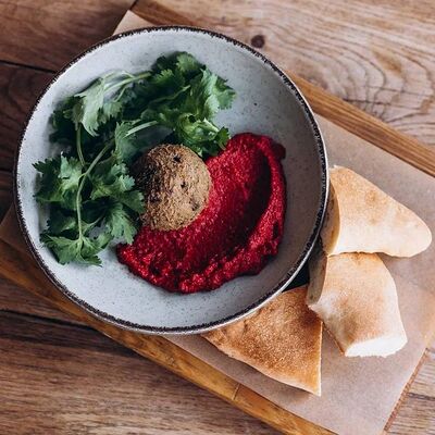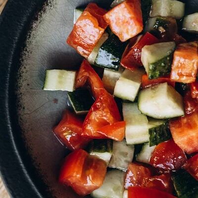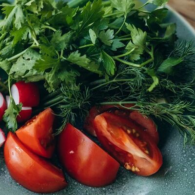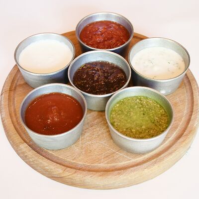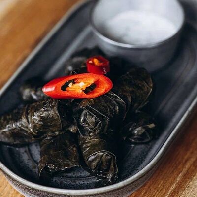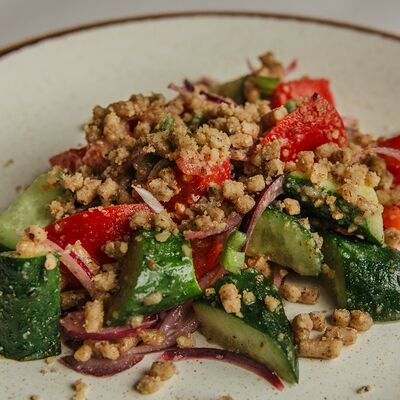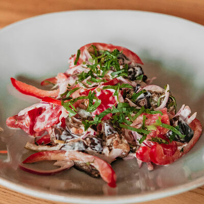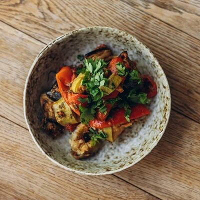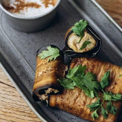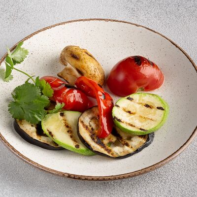 Запеченный баклажан, болгарский перец, перец цицак, помидоры, зелень, чеснок, лук и сливочный соус