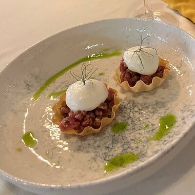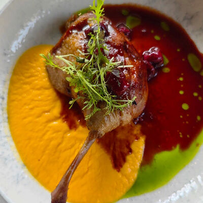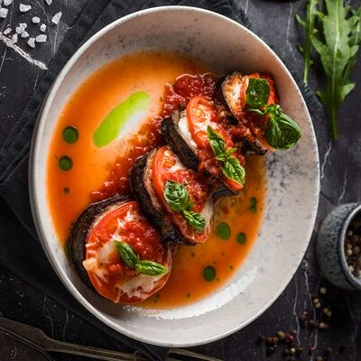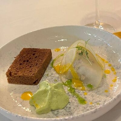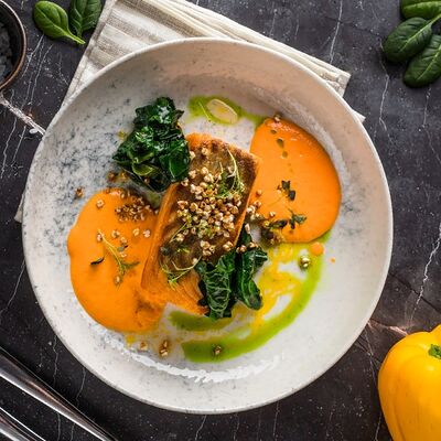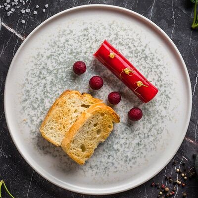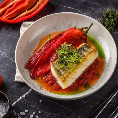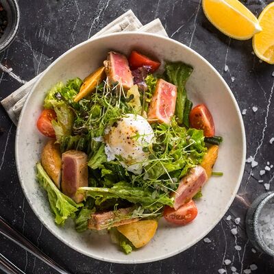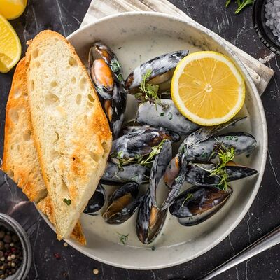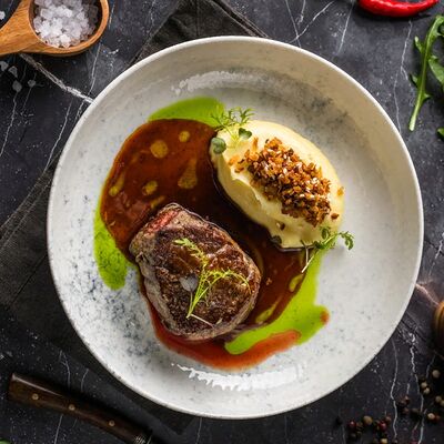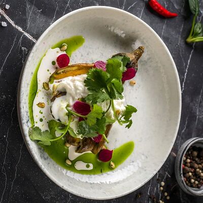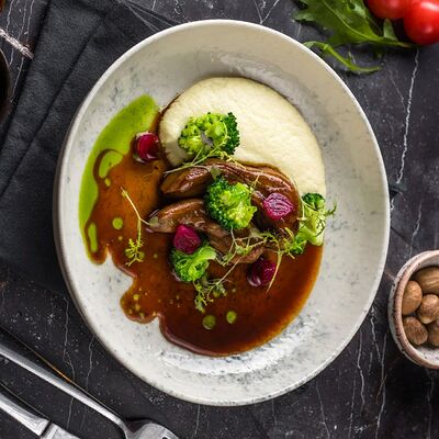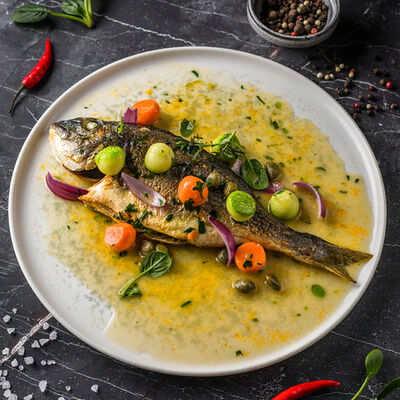 Кальмар, черноморский рапан, мидии в створках и тигровые креветки с миксом салата, оливково-бальзамической заправкой с цитрусовой ноткой с каплями бальзамического крема