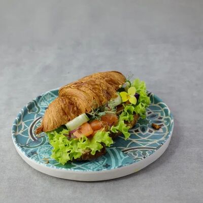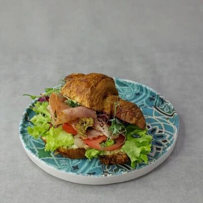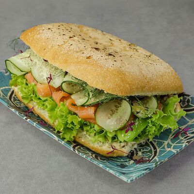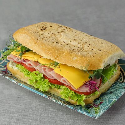 Чиабатта, ветчина, микс салата, розовые томаты, сыр слайсовый, соус цезарь