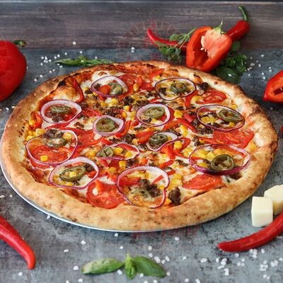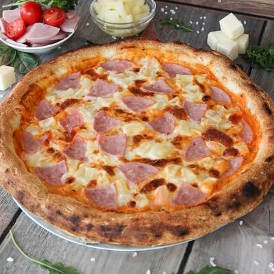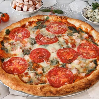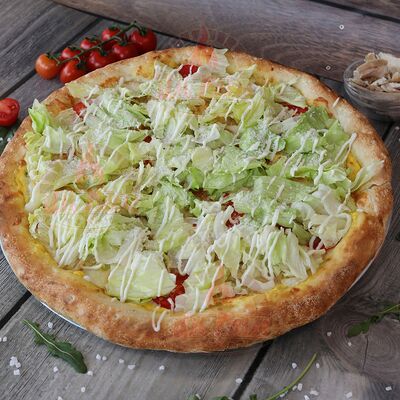 Куриное филе, сыр пармезан, сыр моцарелла, салат айсберг, помидорки, фирменный соус цезарь