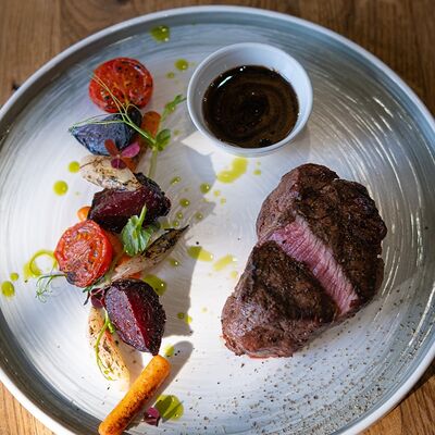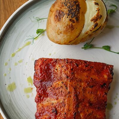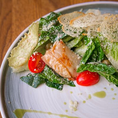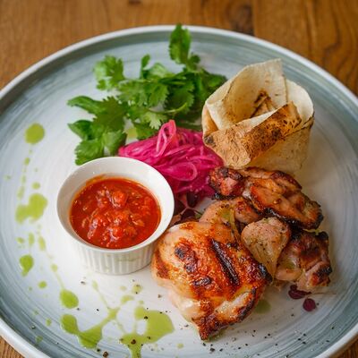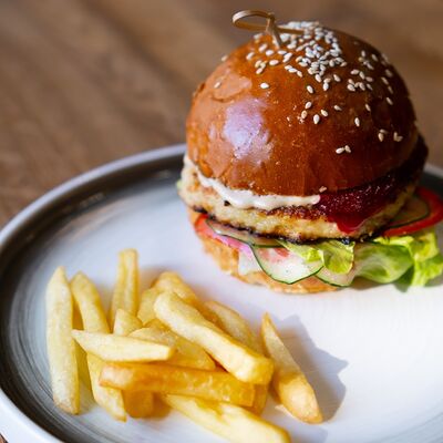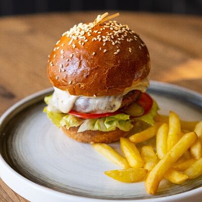 Домашняя булочка бриошь, котлета из филе индейки, лист салата, огурцы, помидоры, майонез, кетчуп