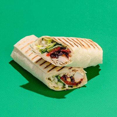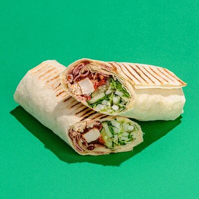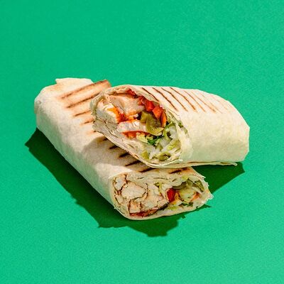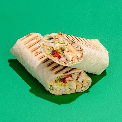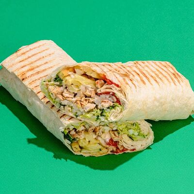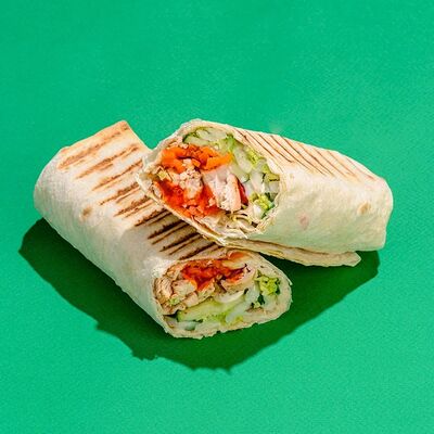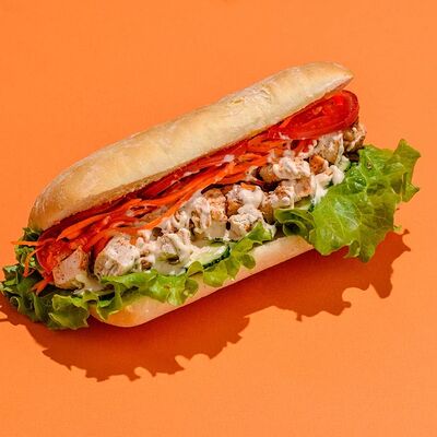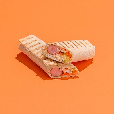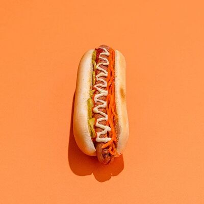 Пшеничная булка, куриная сосиска, маринованный огурец, морковь по-корейски, соусы фирменный и красный