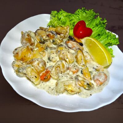 Семга, мидии, креветки, сливки, кабачки, морковь
