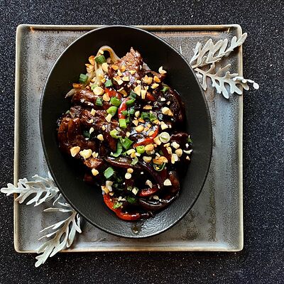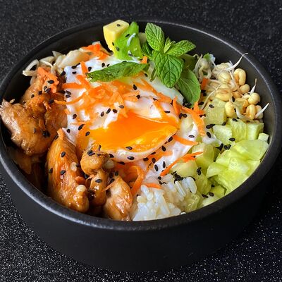 Рис, баклажан, куриная грудка, жареный лук