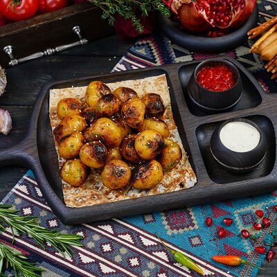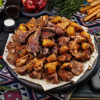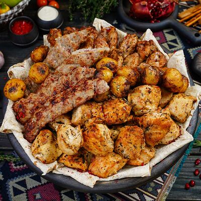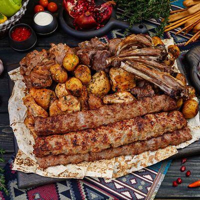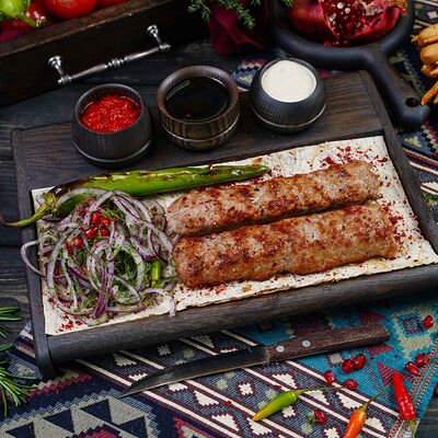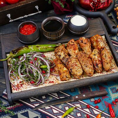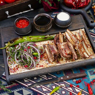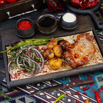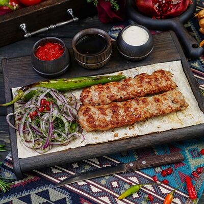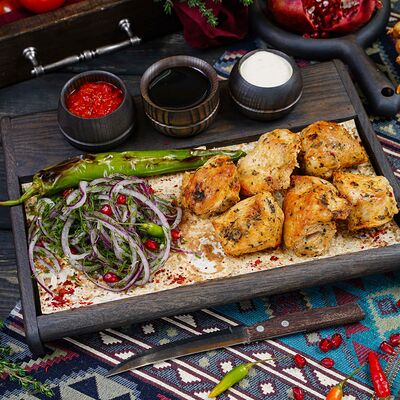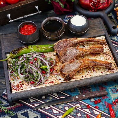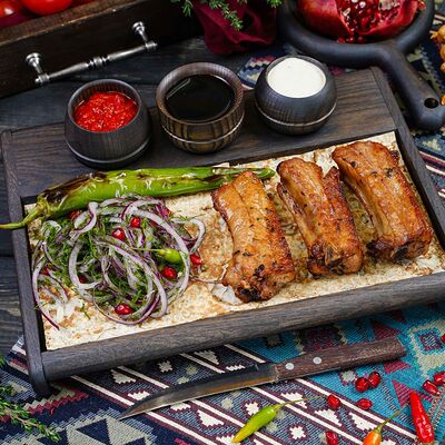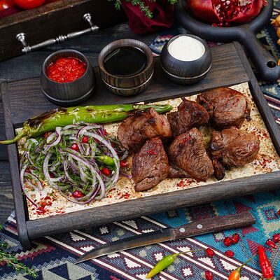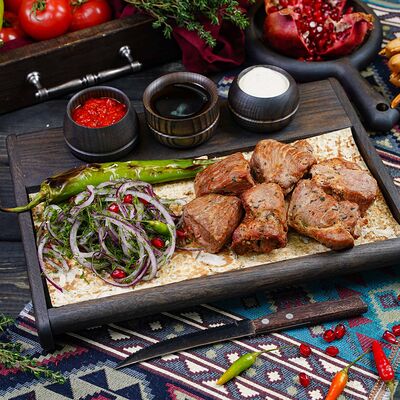 Классический шашлык из бараньей мякоти на мангале с фирменным миксом специй, соус шашлычный, лаваш