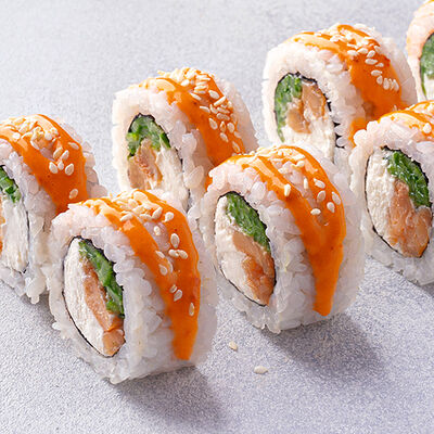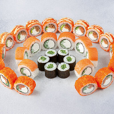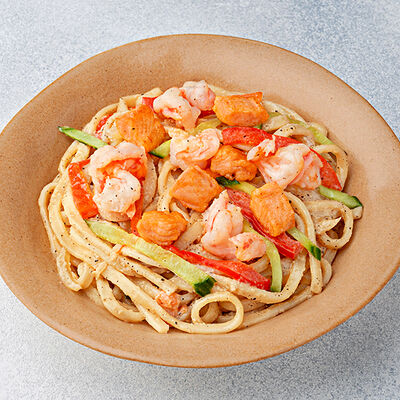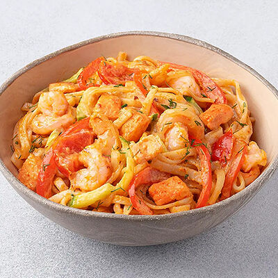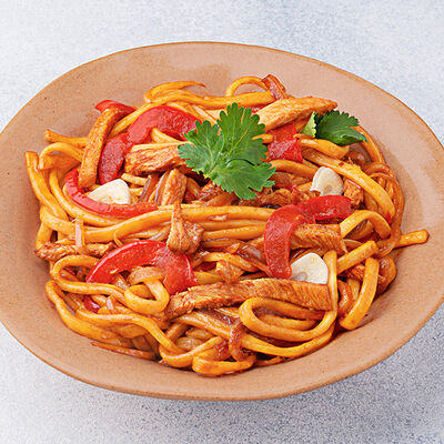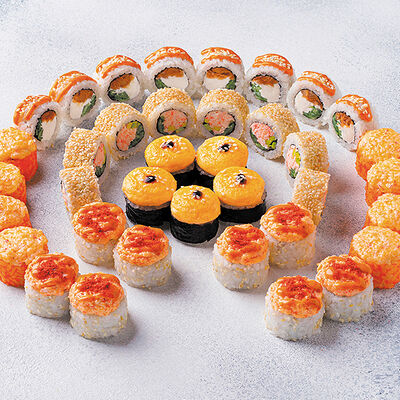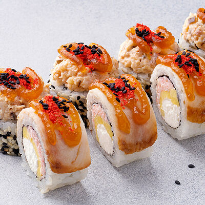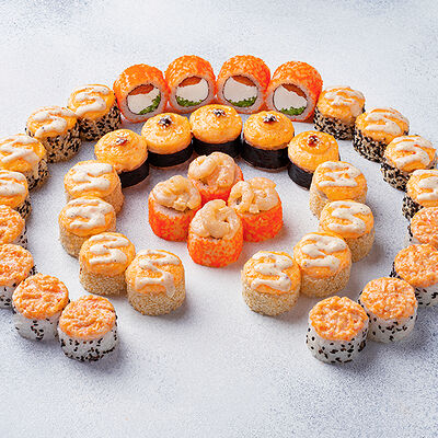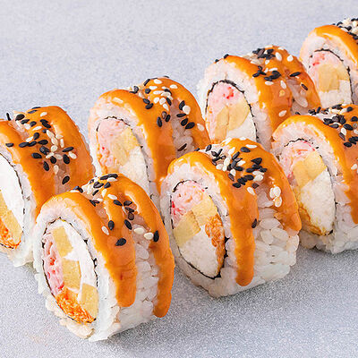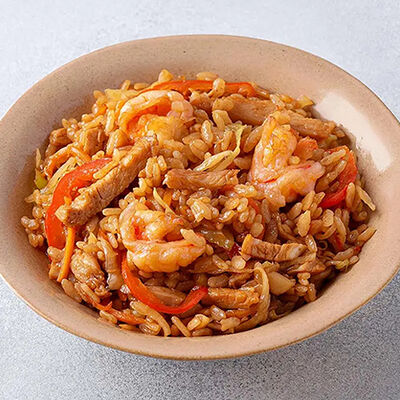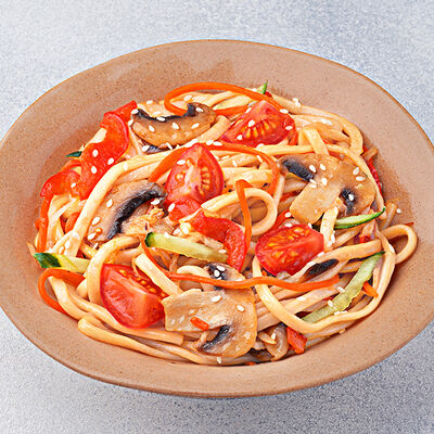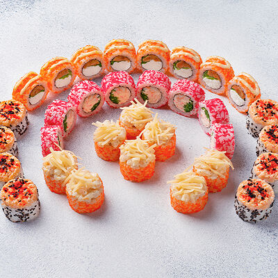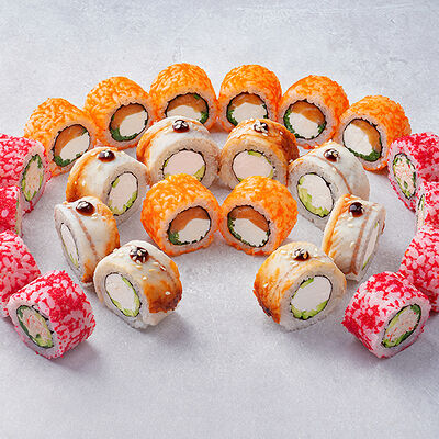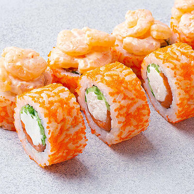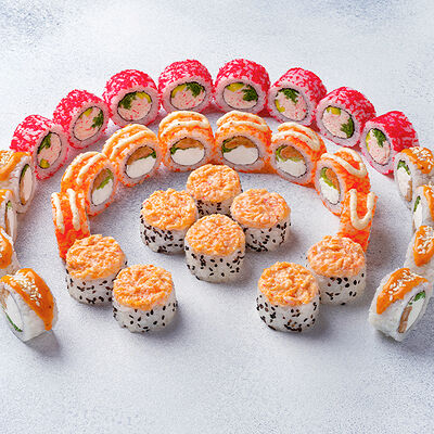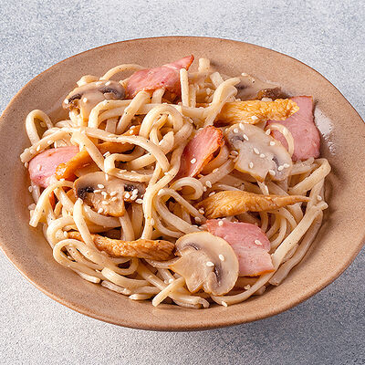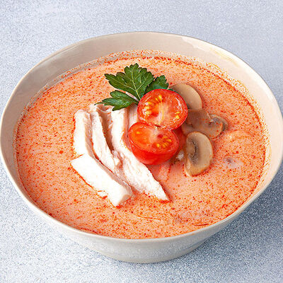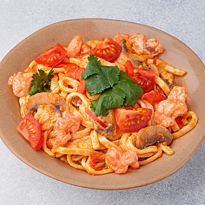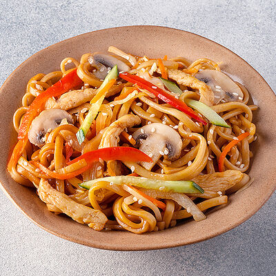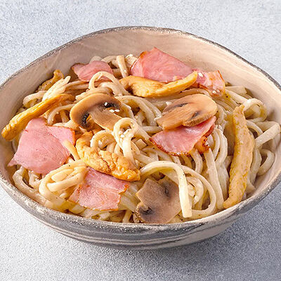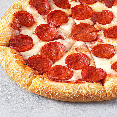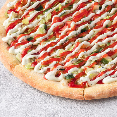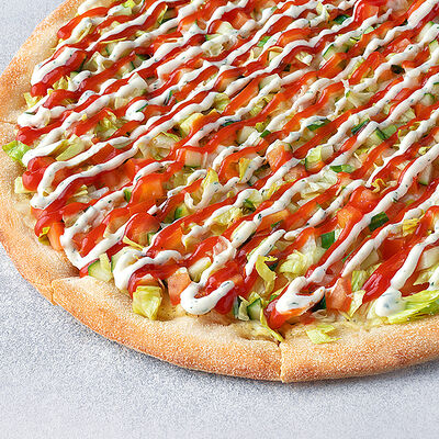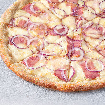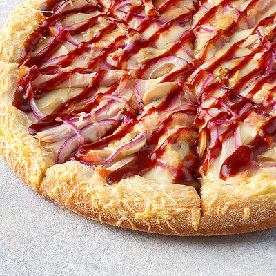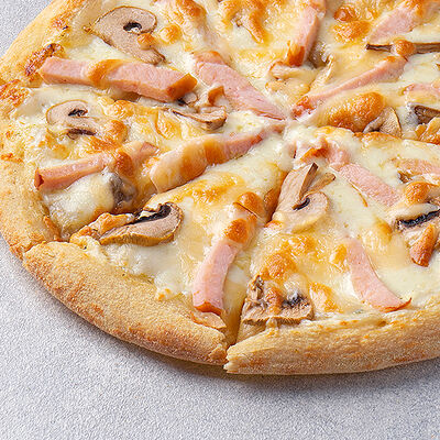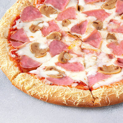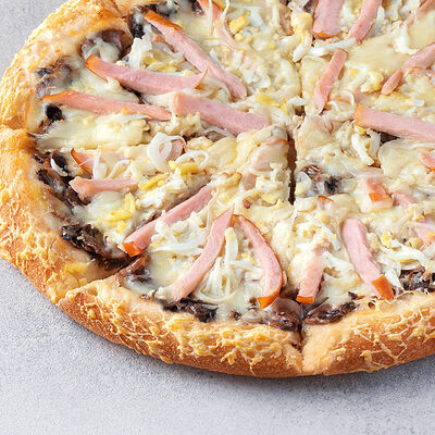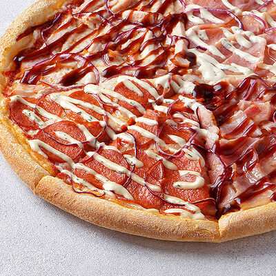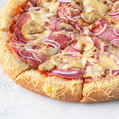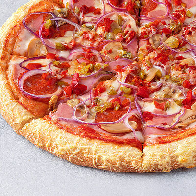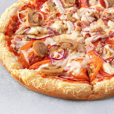 Цыплёнок, пепперони, ветчина, моцарелла, пармезан, шампиньоны, томаты, красный лук, пицца-соус