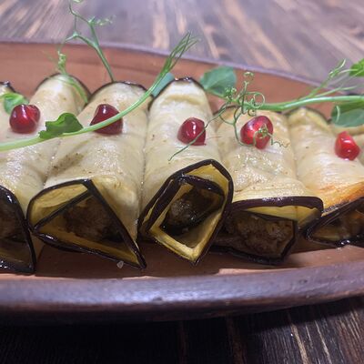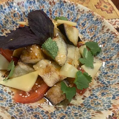 Нежная свинина с овощным соте, запеченная с картофелем под сыром сулугуни
