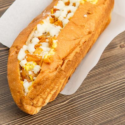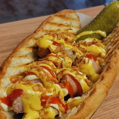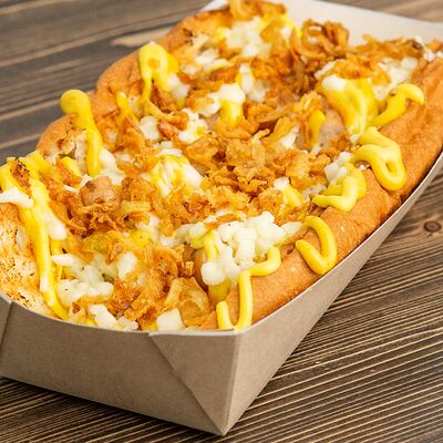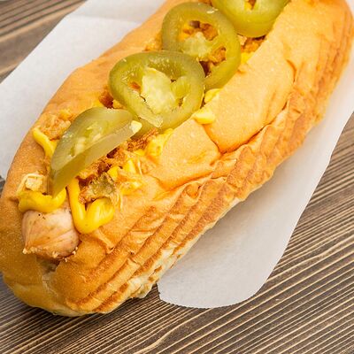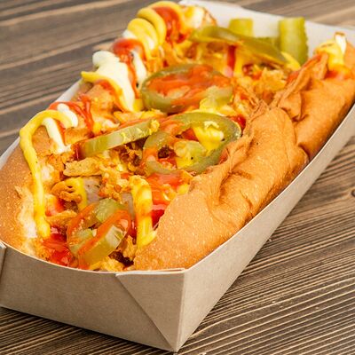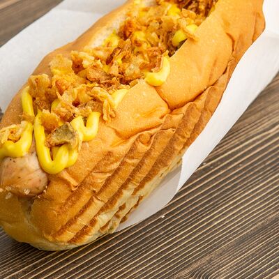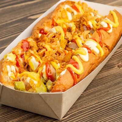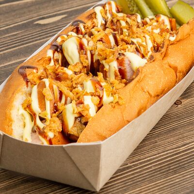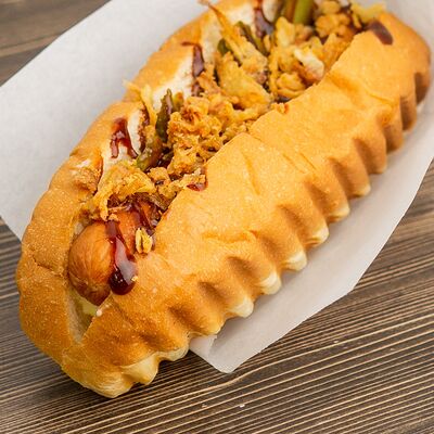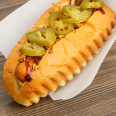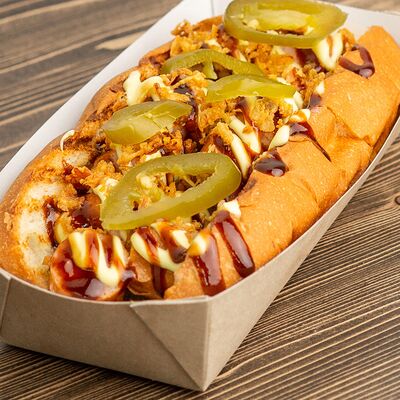 Поджаренная на гриле булочка, подкопченная сосиска (свинина), обжаренная на гриле, хрустящий лучок фри, халапеньо, майонез, соус барбекю