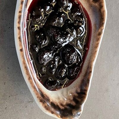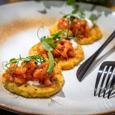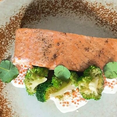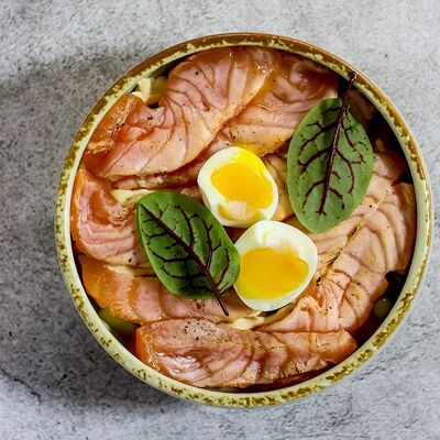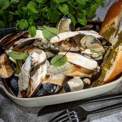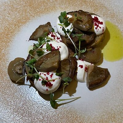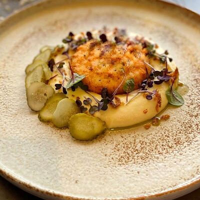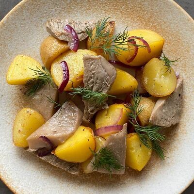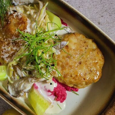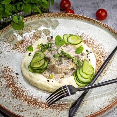 Котлетки (куриное бедро, бекон, лук репчатый, соль, перец, яйцо куриное, сухари панировочные), пюре (картофель, молоко 3,2%, масло сливочное, соль, сок свеклы), фрикасе (грибы вешенки, лук-порей, сливки 20%, соль, перец, соевый соус, огурец маринованный)
