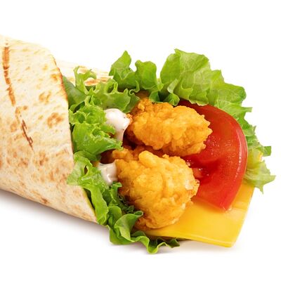 Креветки в хрустящей панировке, свежий салат и соус 1000 островов в тортилье, подрумяненной на гриле