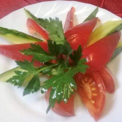 Свежие помидор, огурец, перец сладкий и редис, салат, зелень
