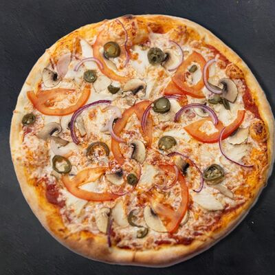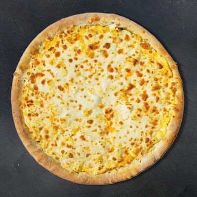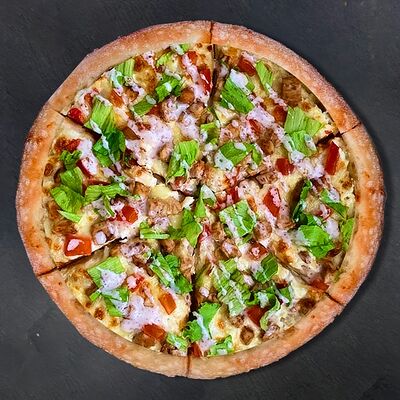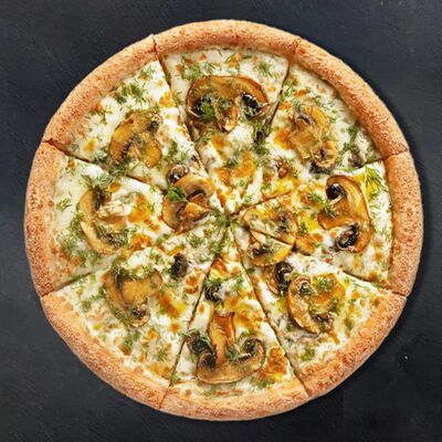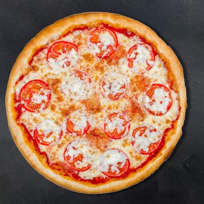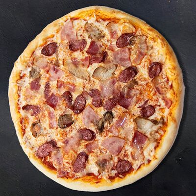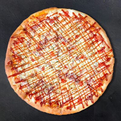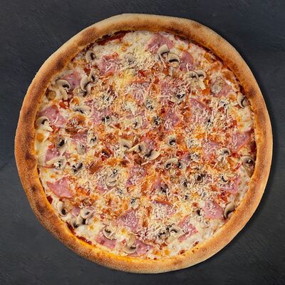 Сливочный соус, сыр, ветчина, бекон, шампиньоны, помидор (33 см)