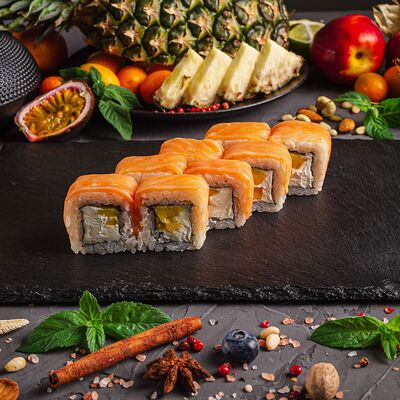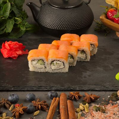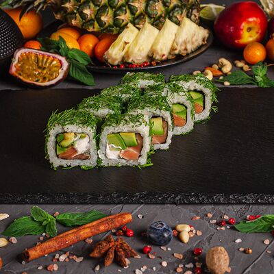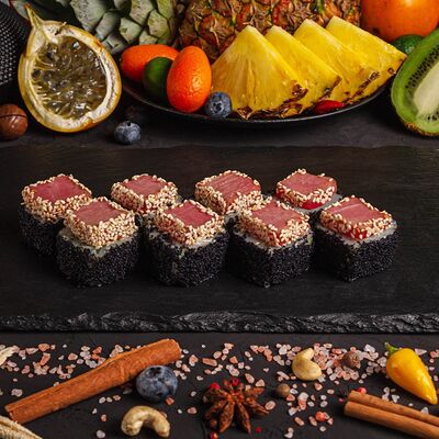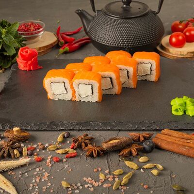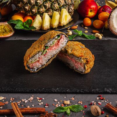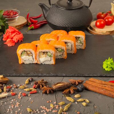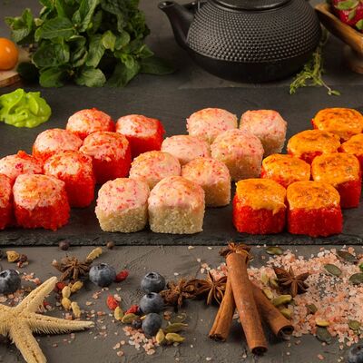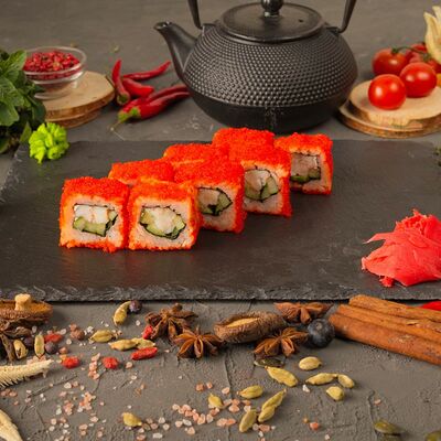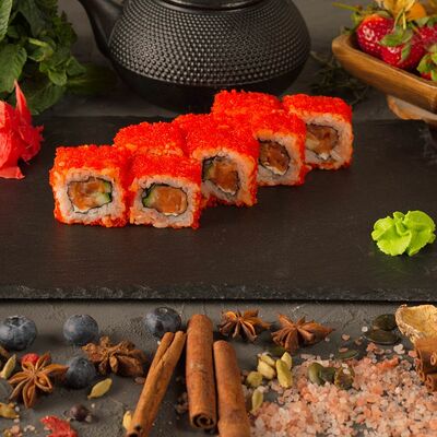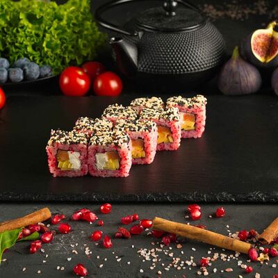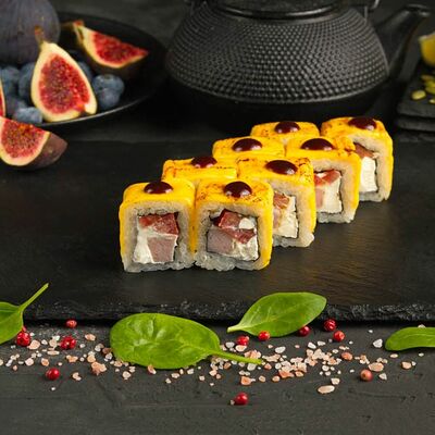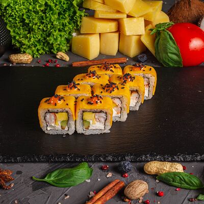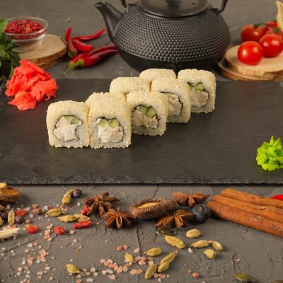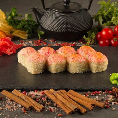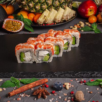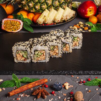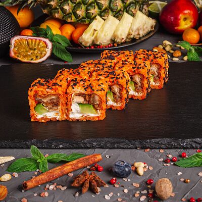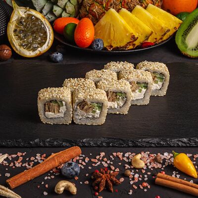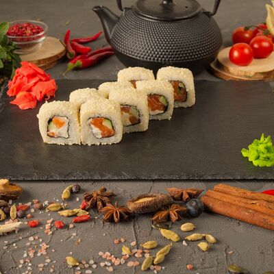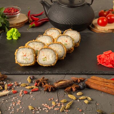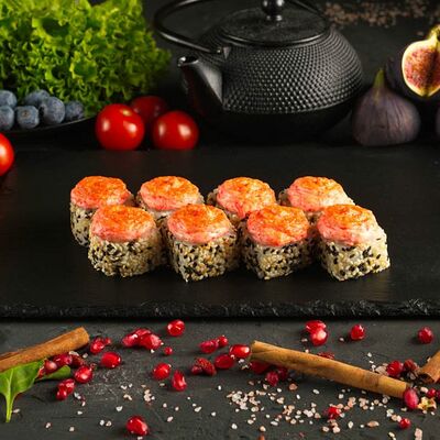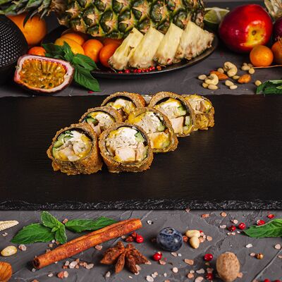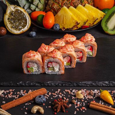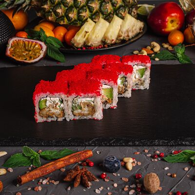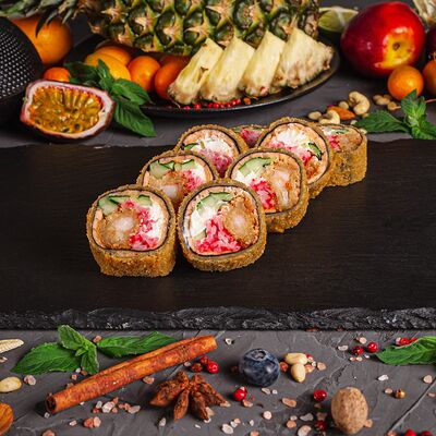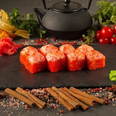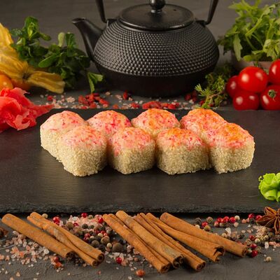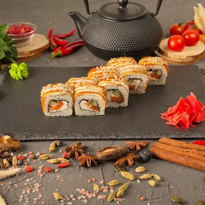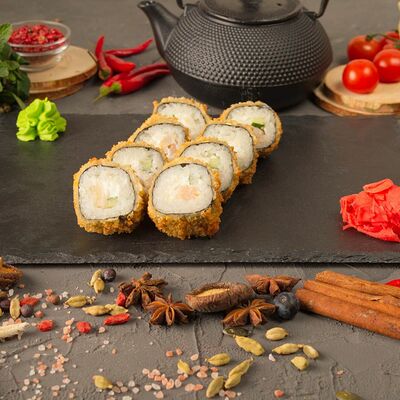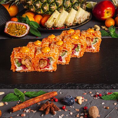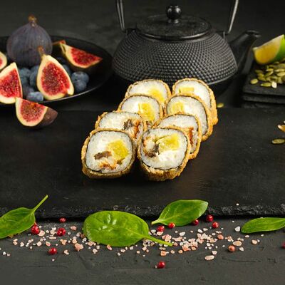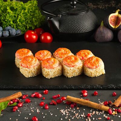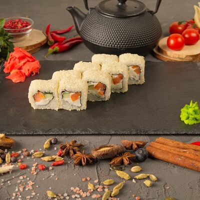 Рис, спринг тесто, сливочный сыр, лосось темпура, масаго, авокадо, кунжут