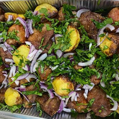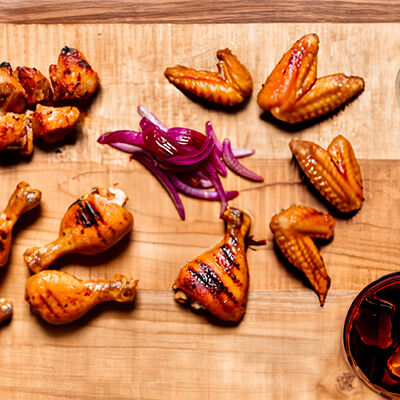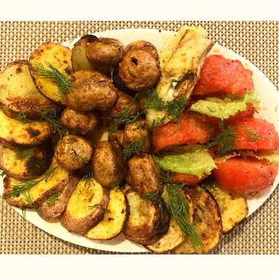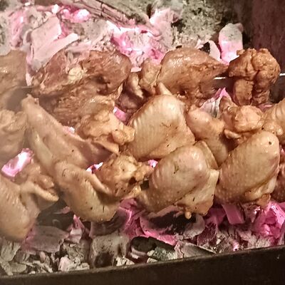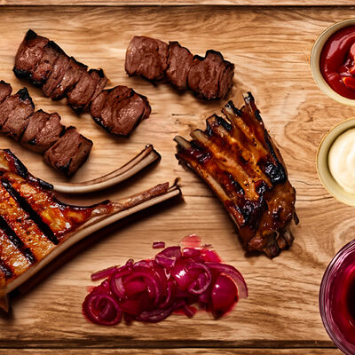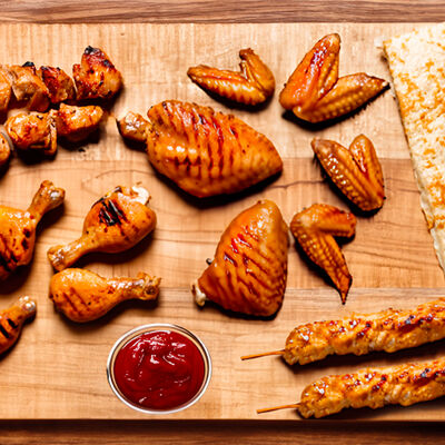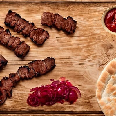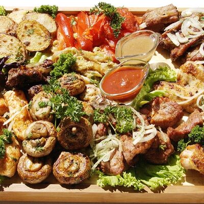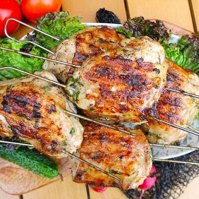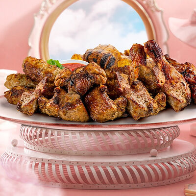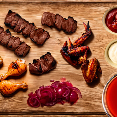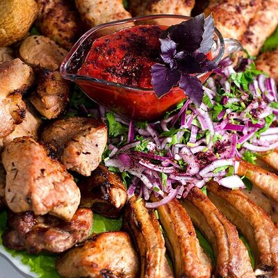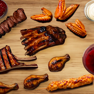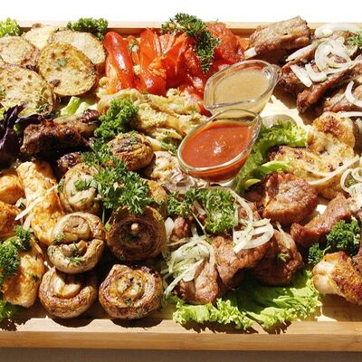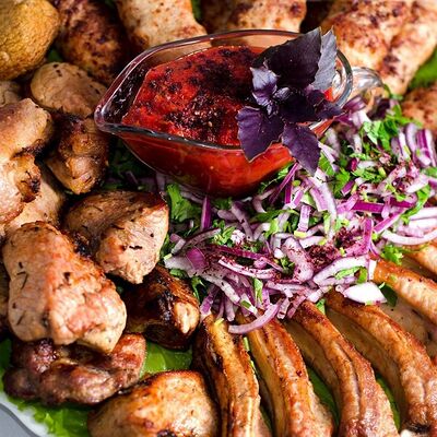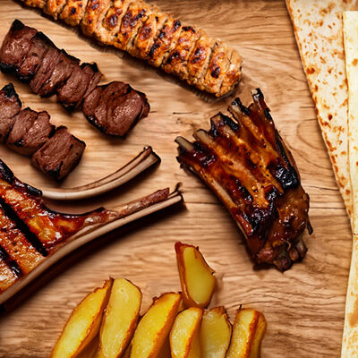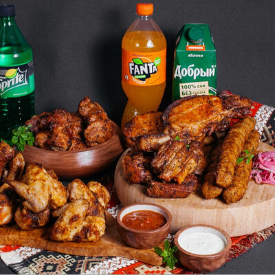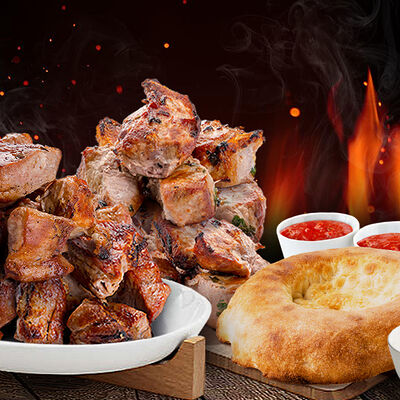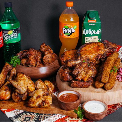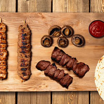 Люля-кебаб куриный (350 г), люля-кебаб cвинoй (350 г), шашлык из cвинoй шеи (300 г), грибы на мангале (200 г), соус на выбор (1 шт.), лаваш тонкий (1 шт.)
