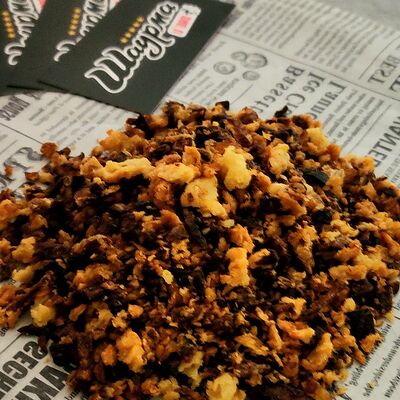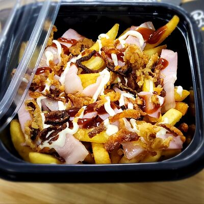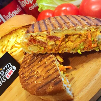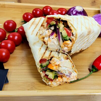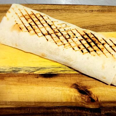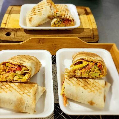 Лаваш, куриное филе, сыр моцарелла, помидорка, жареный лучок, петрушка, соус BBQ, соус сливочно-чесночный
