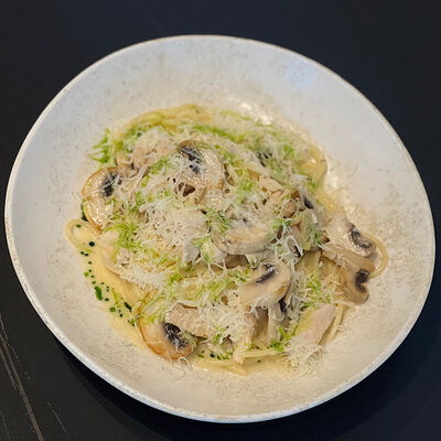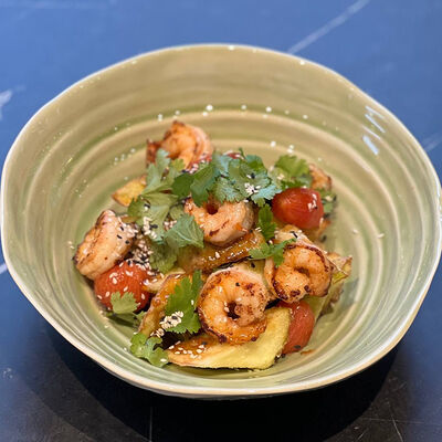 Баклажаны, креветки, азиатский соус, сыр моцарелла