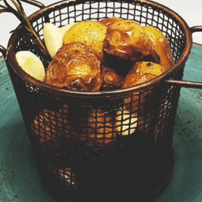 Домашние колбаски из мраморной говядины, дольки фри, кетчуп, горчица, жареная капуста