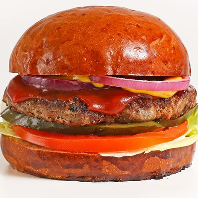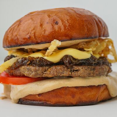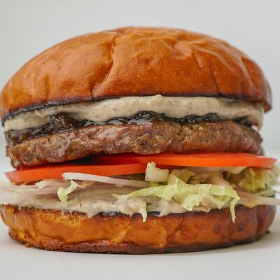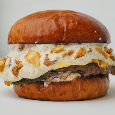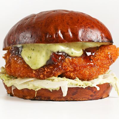Нежное куриное филе в молочной булочке, с сочной пекинской капустой, освежающим соусом из шпината и зеленого яблока, завершенным джемом из сладкого перца и томатами