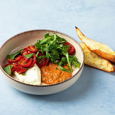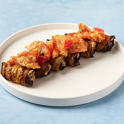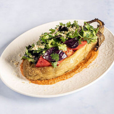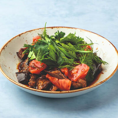 Печеный на углях баклажан, свежие помидоры, зелень, кахетинское масло, грецкий орех, соус из печеного болгарского перца