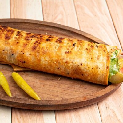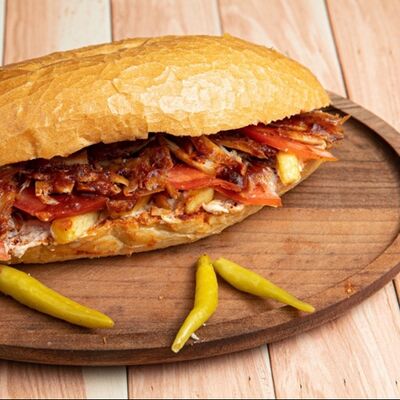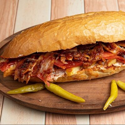 Говяжья котлета, кусочки телятины, острый нарезанный перец халапеньо и соус Gastro