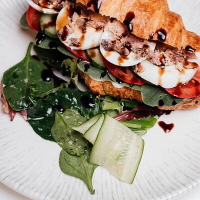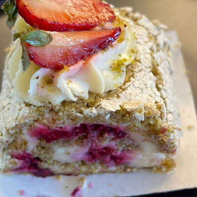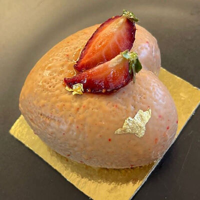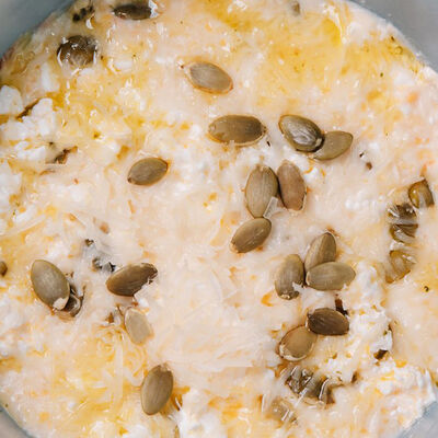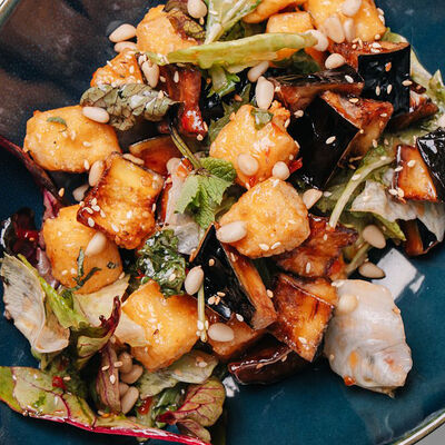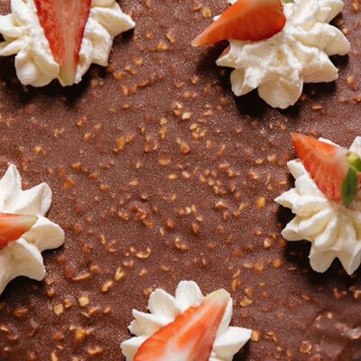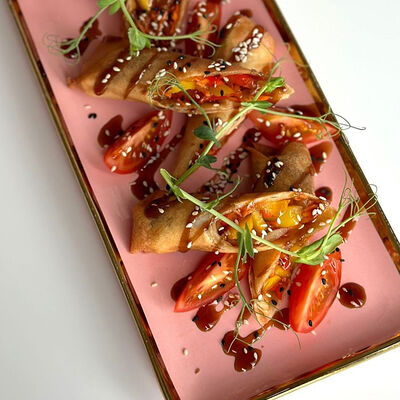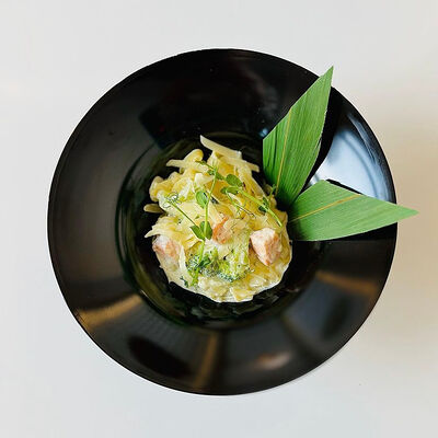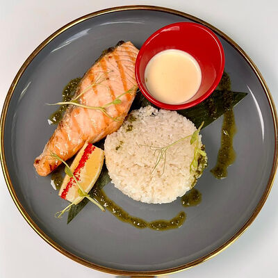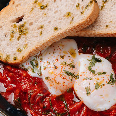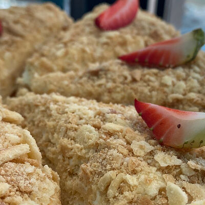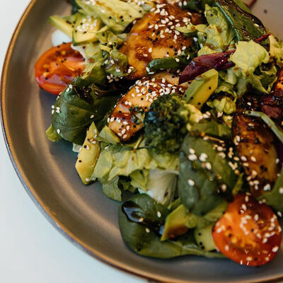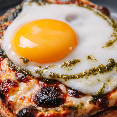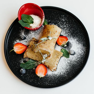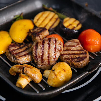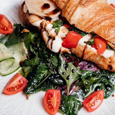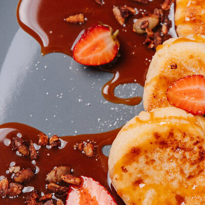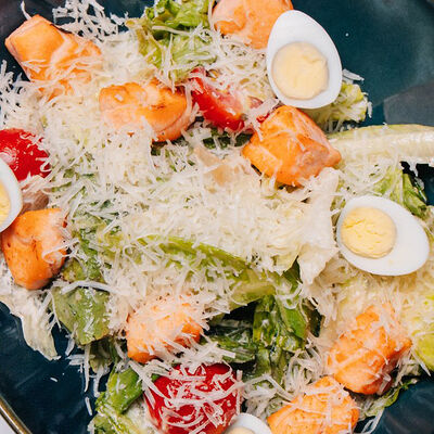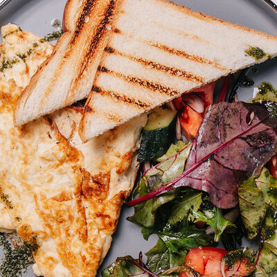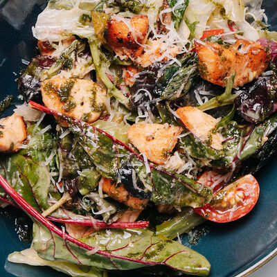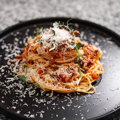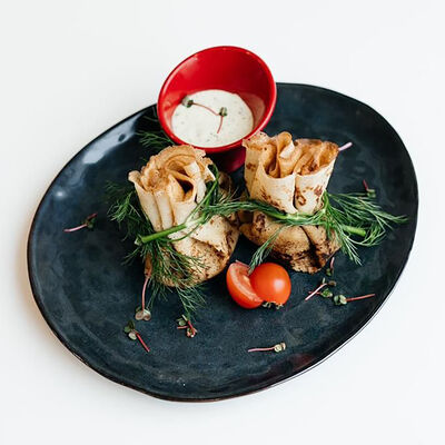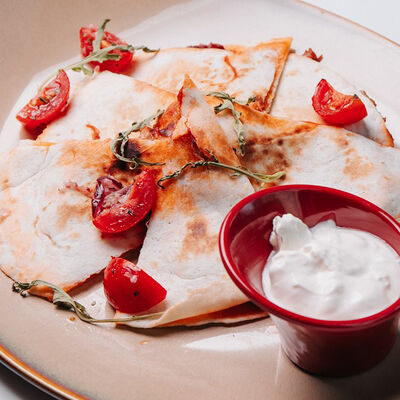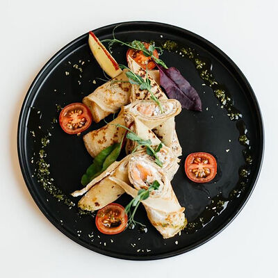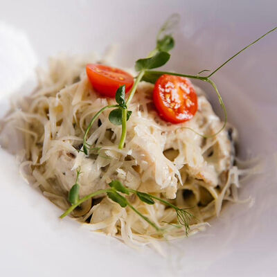Куриное филе, лук, чеснок, тимьян в сливочном соусе. Посыпается сыром пармезан, подается с томатами черри