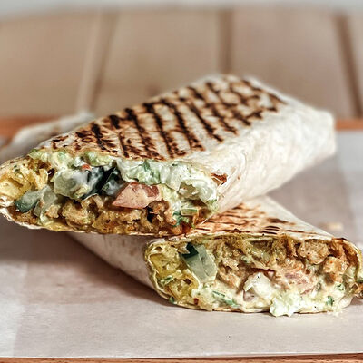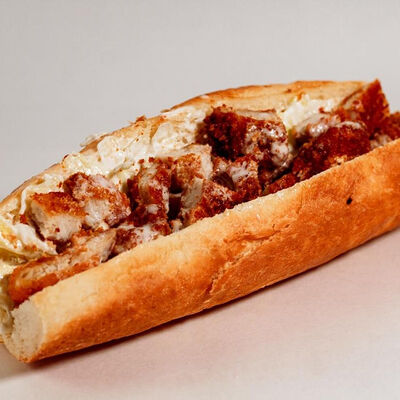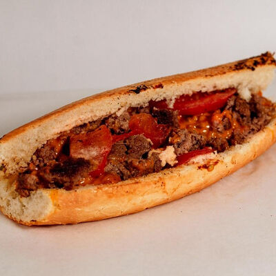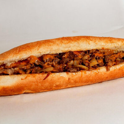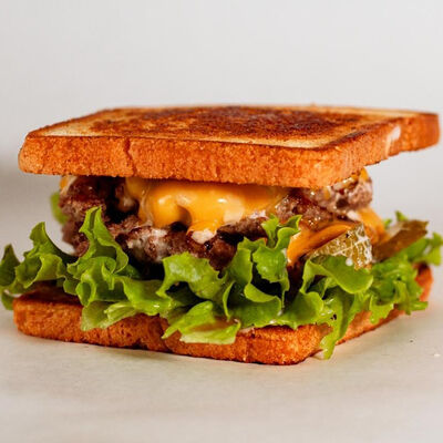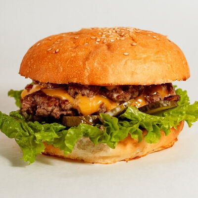 Двойная котлета из мраморной говядины Черный Ангус (75 г), сыр чеддер, соленые огурчики, салат, фирменный белый соус, фирменный красный соус