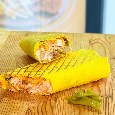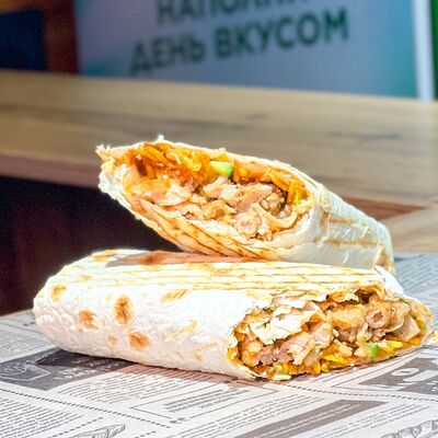 Мясо курицы, помидоры, солёные огурцы, айсберг, сыр чеддер, фирменный соус (два вида)