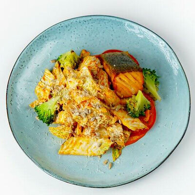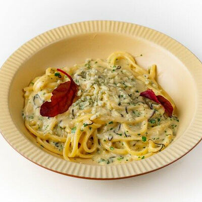 Паста, шпинат, сливки, зелень, черри, пармезан