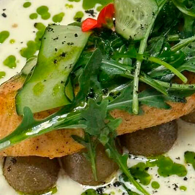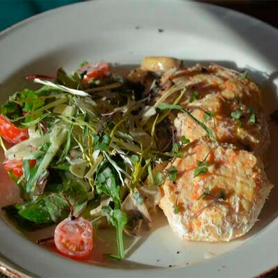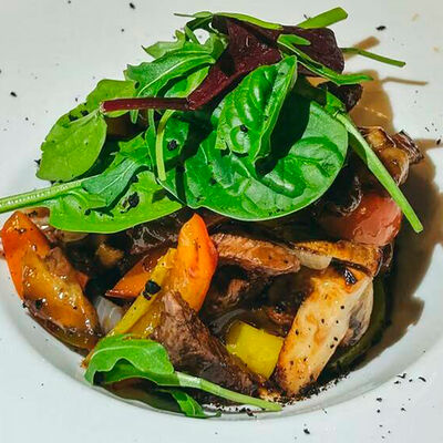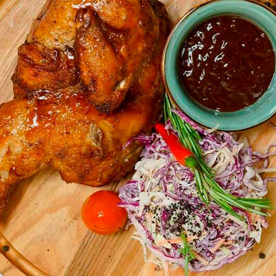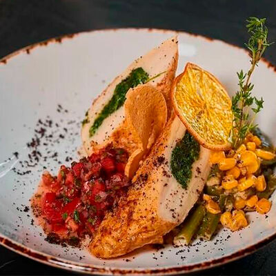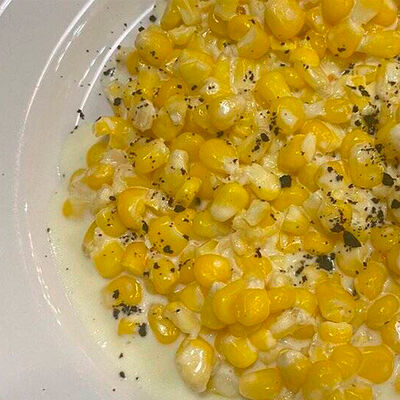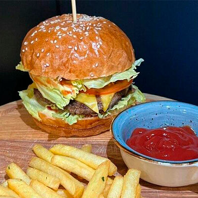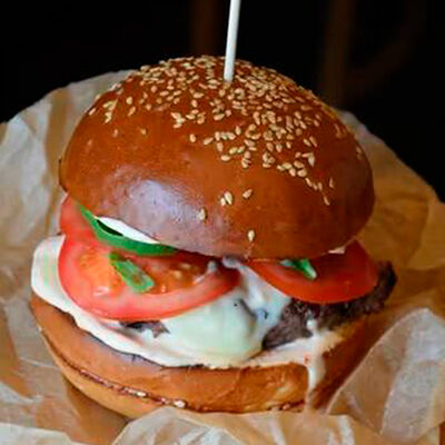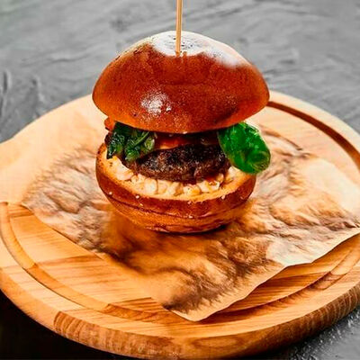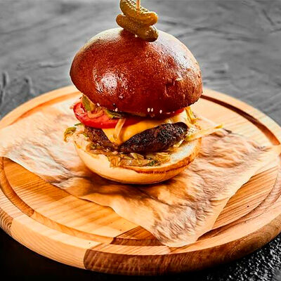 Булочка собственного производства, котлета говяжья, кукуруза в сливках, соус эскабече, сыр чеддер, шпинат