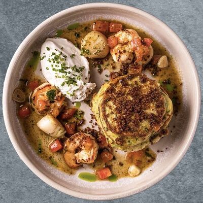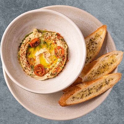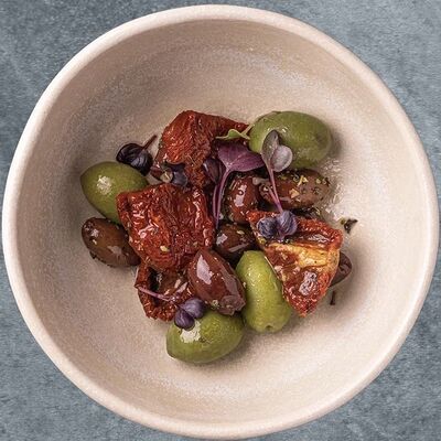 Хлеб, мусс из сливочного сыра с оливками, маринованная форель, томаты, авокадо, микс-салат